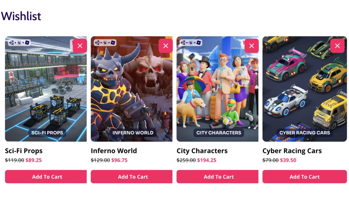 Save assets for later with our new Wishlist feature! Browse the catalog, click “Add to Wishlist” on any pack, and build your collection of favorites for future purchase.