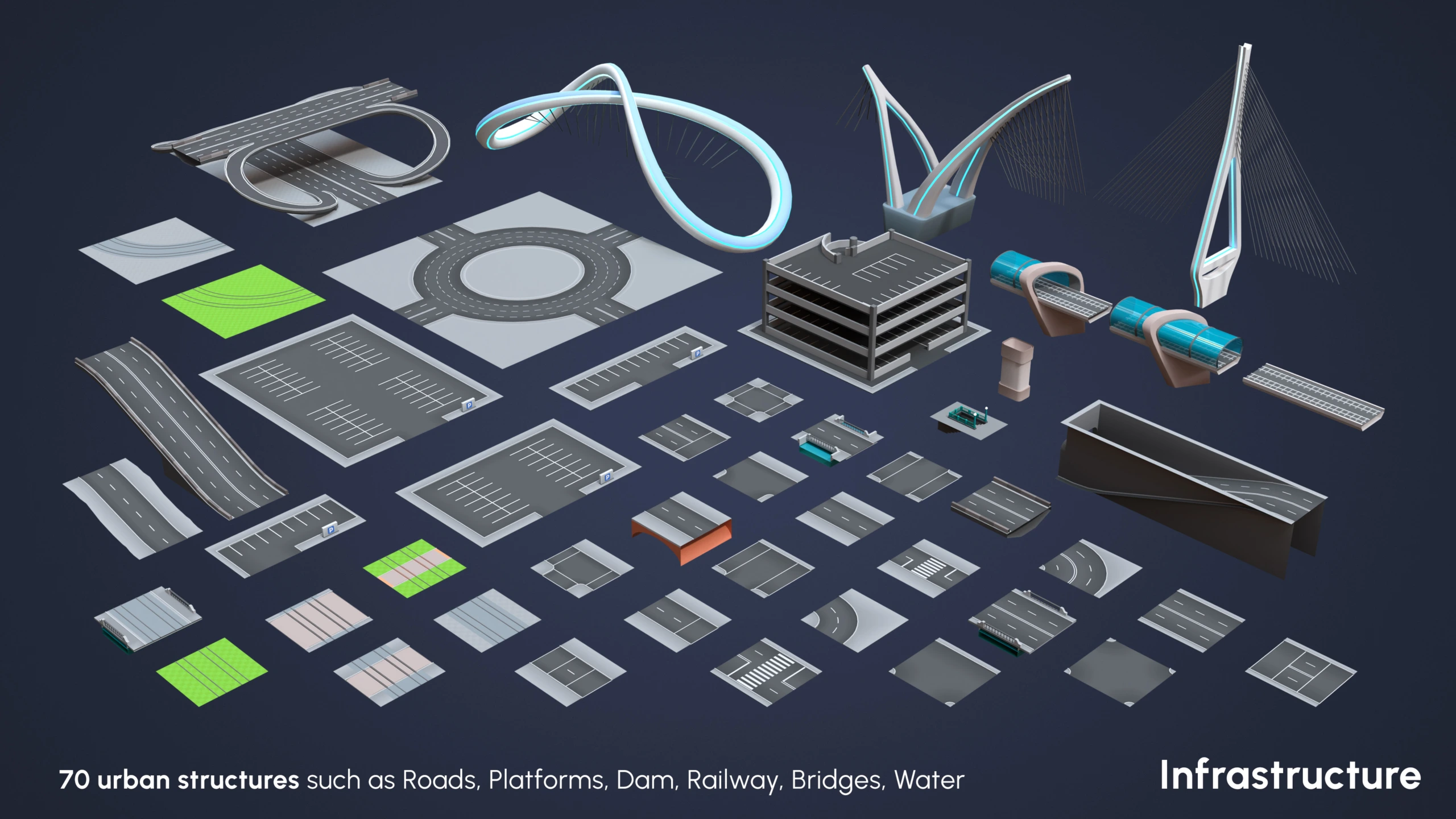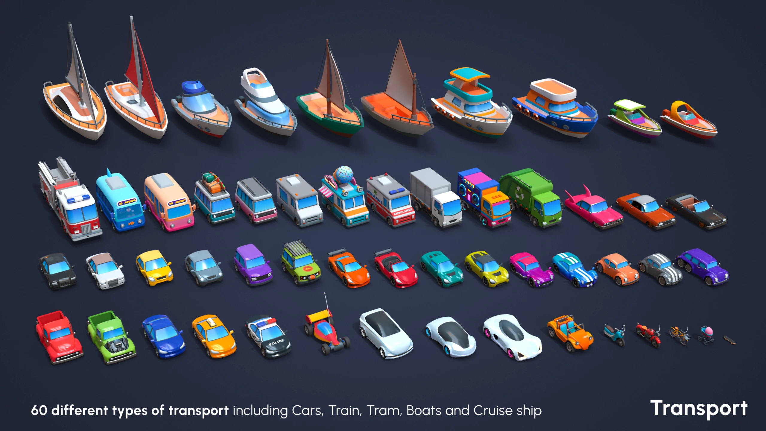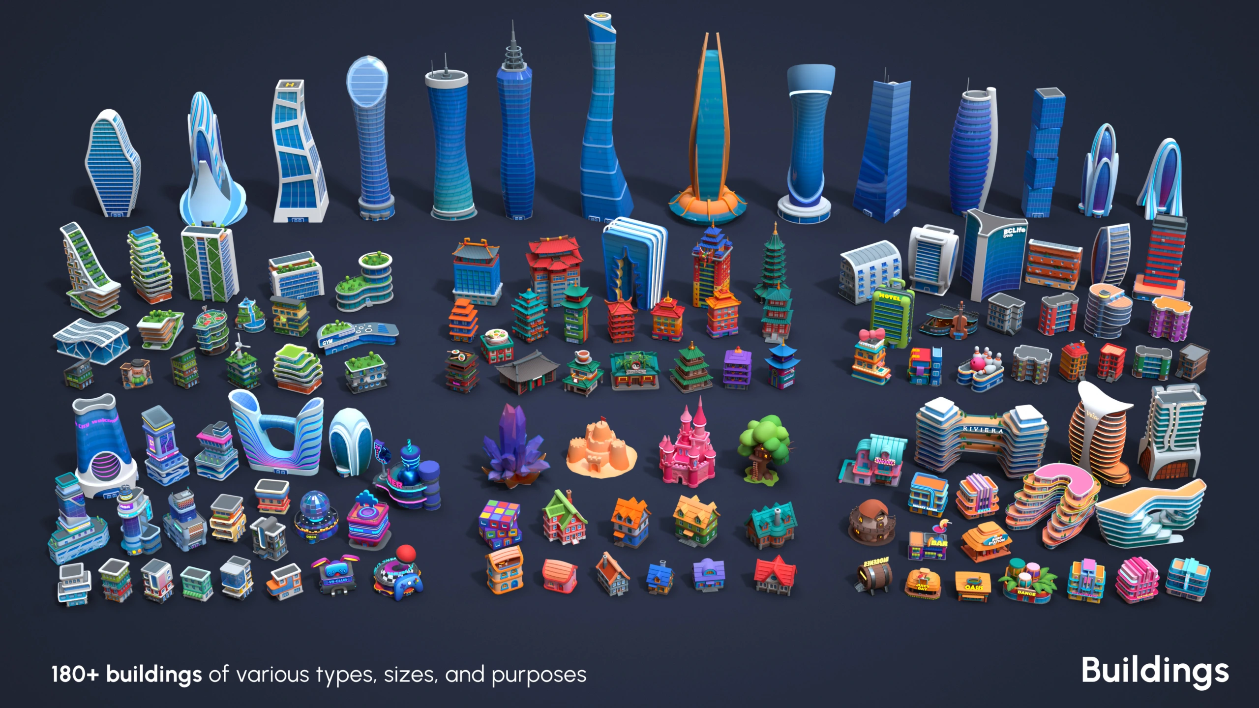 - Over 600 Unique City Assets: pack includes over 600 unique assets for building the city: buildings of various themes, purposes, and sizes, infrastructure, landscape, public spaces, props, landmarks, banners, and sports facilities.It also includes 60 vehicles: watercraft (liner, yachts, boats), trains (regular and high-speed), cars, special vehicles, buses, and trucks. One asset can consist of several meshes.