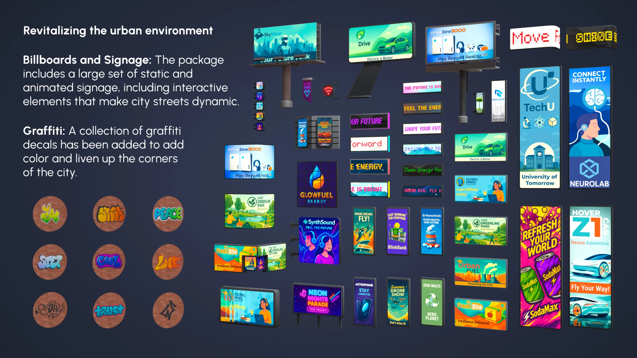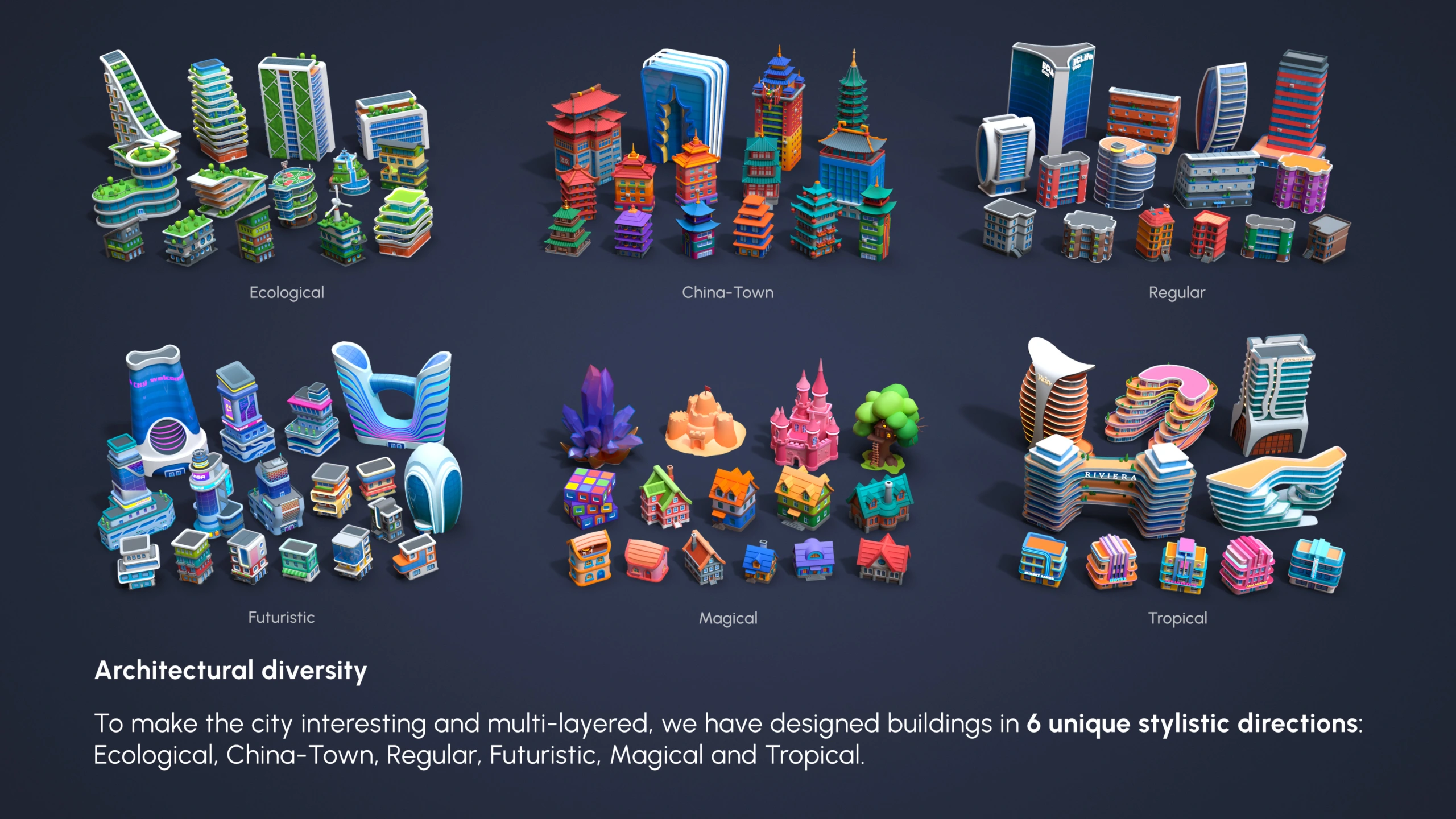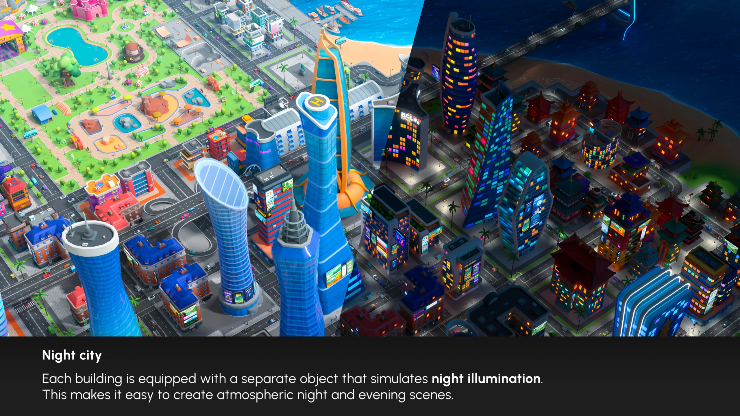 - Over 600 Unique City Assets: pack includes over 600 unique assets for building the city: buildings of various themes, purposes, and sizes, infrastructure, landscape, public spaces, props, landmarks, banners, and sports facilities.It also includes 60 vehicles: watercraft (liner, yachts, boats), trains (regular and high-speed), cars, special vehicles, buses, and trucks. One asset can consist of several meshes.