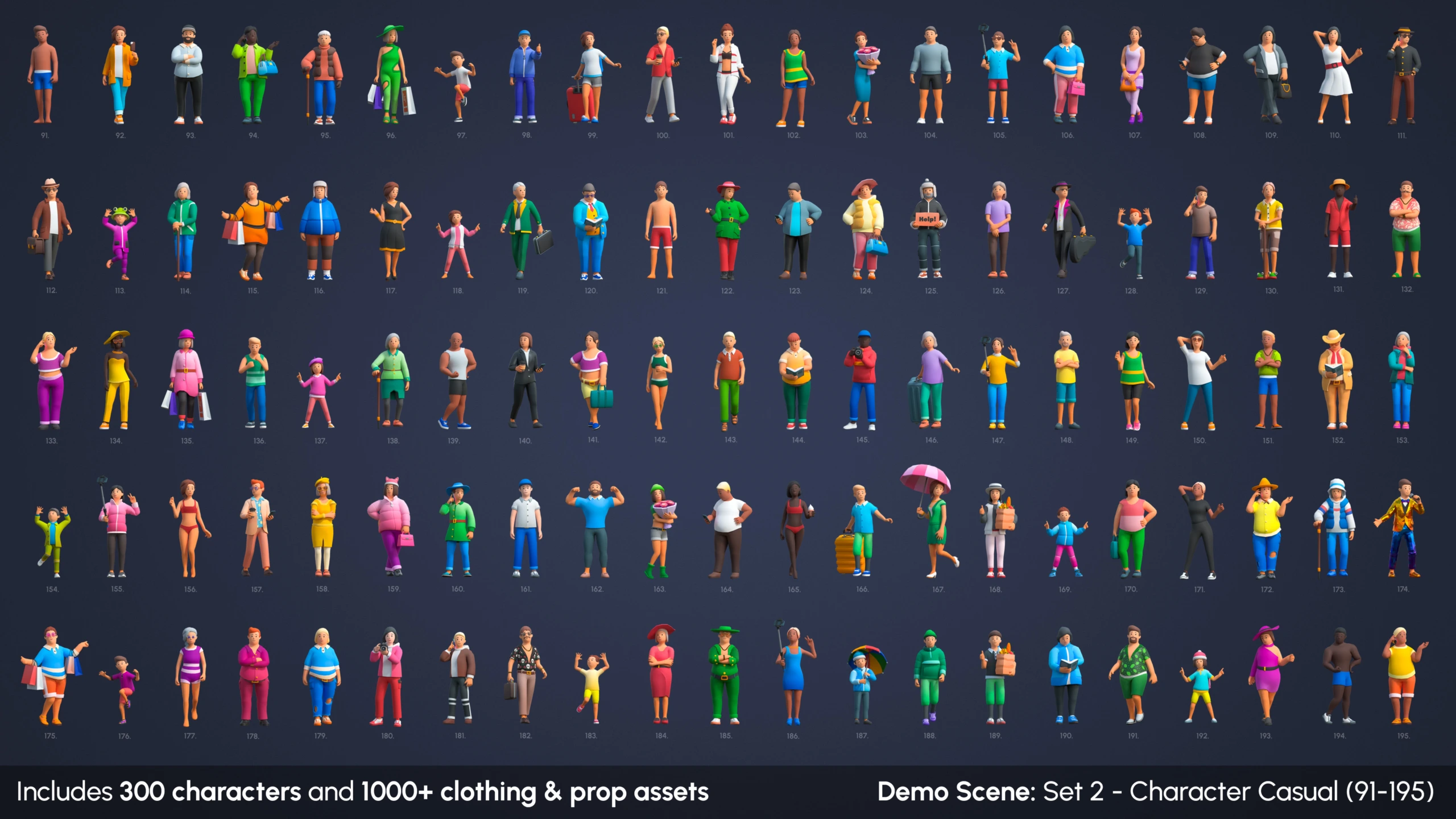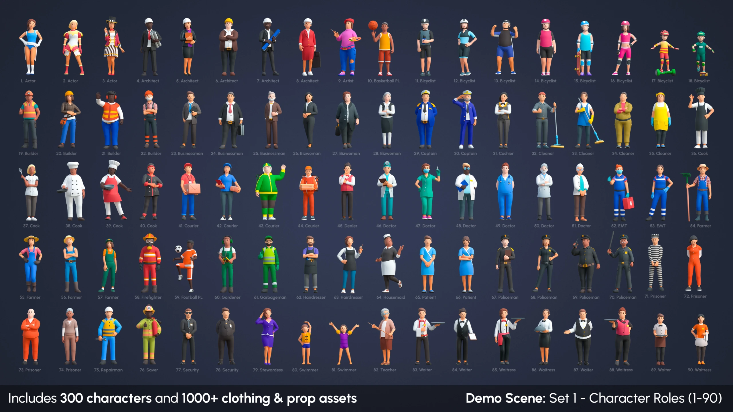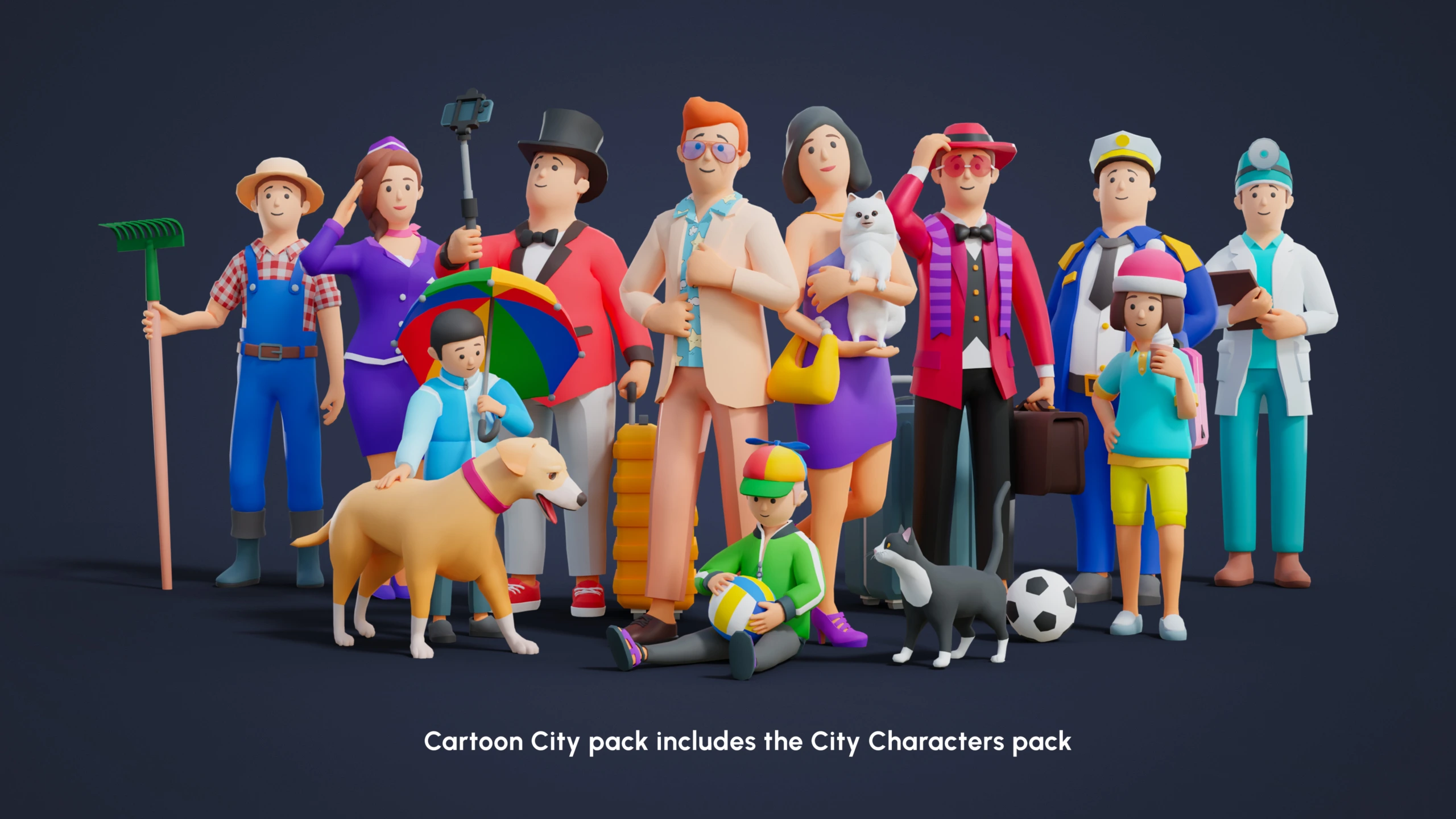 - City Characters Pack: 300 prepared 3D characters of various ages, body types, and skin tones, 1100+ clothing assets, customization tool, movement controller, animations, facial expressions, 100+ props, animals, icons. More detailed description