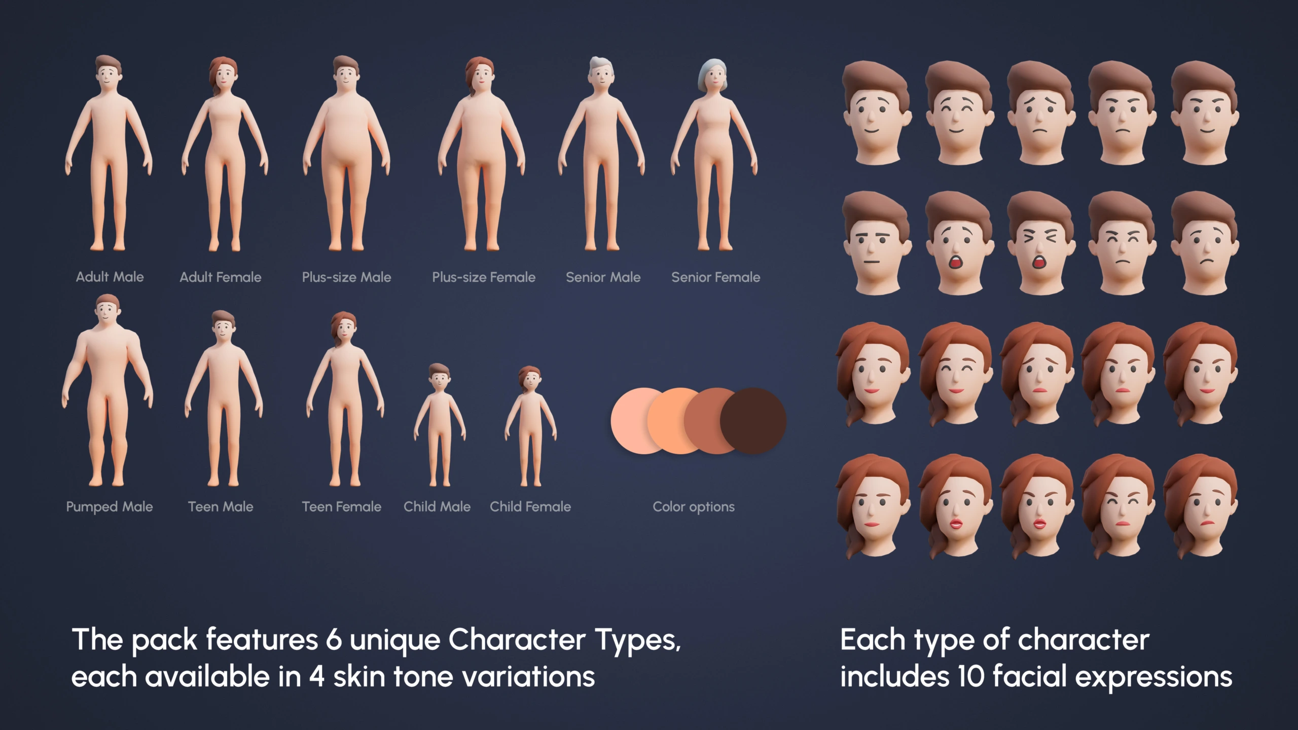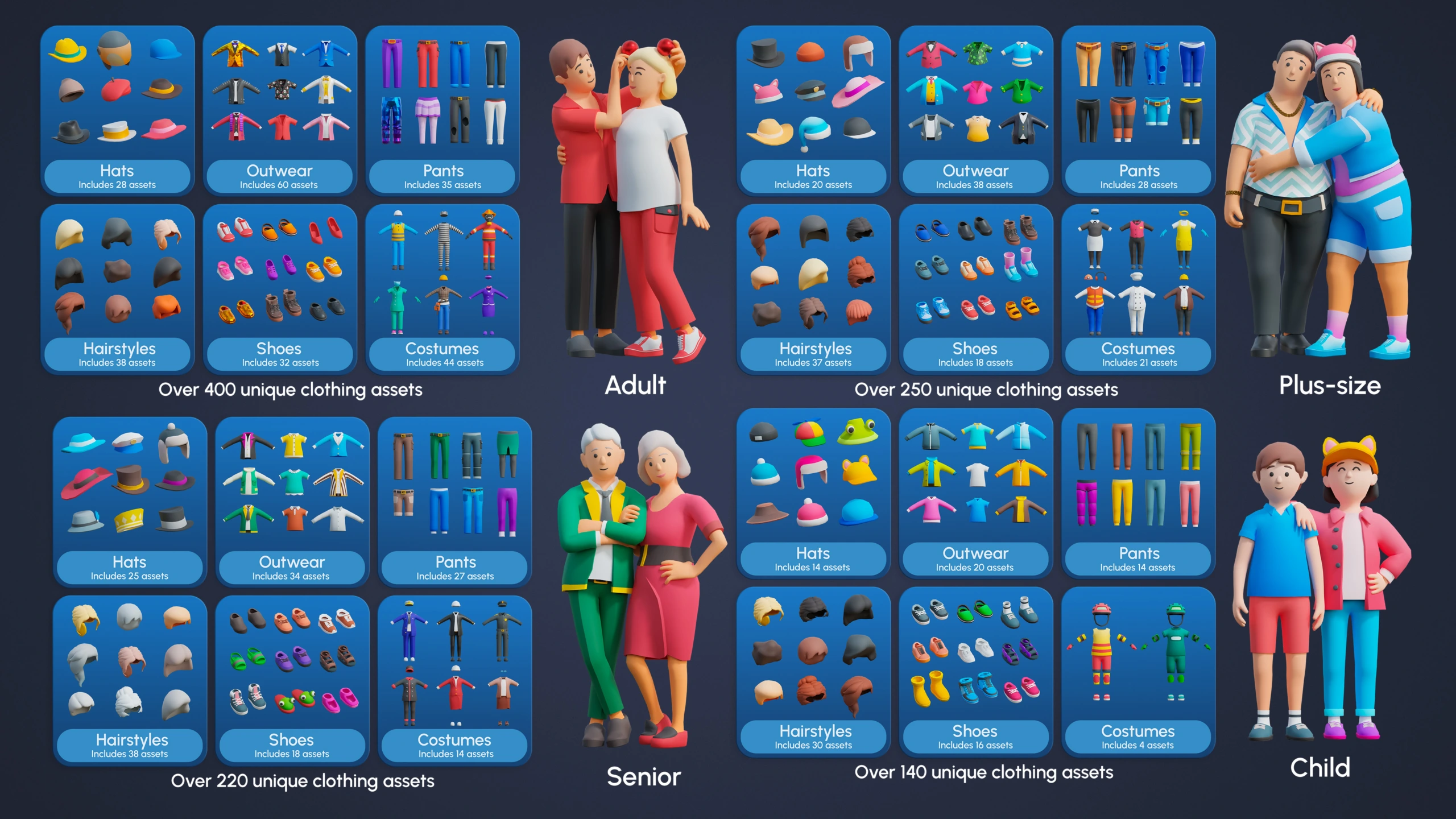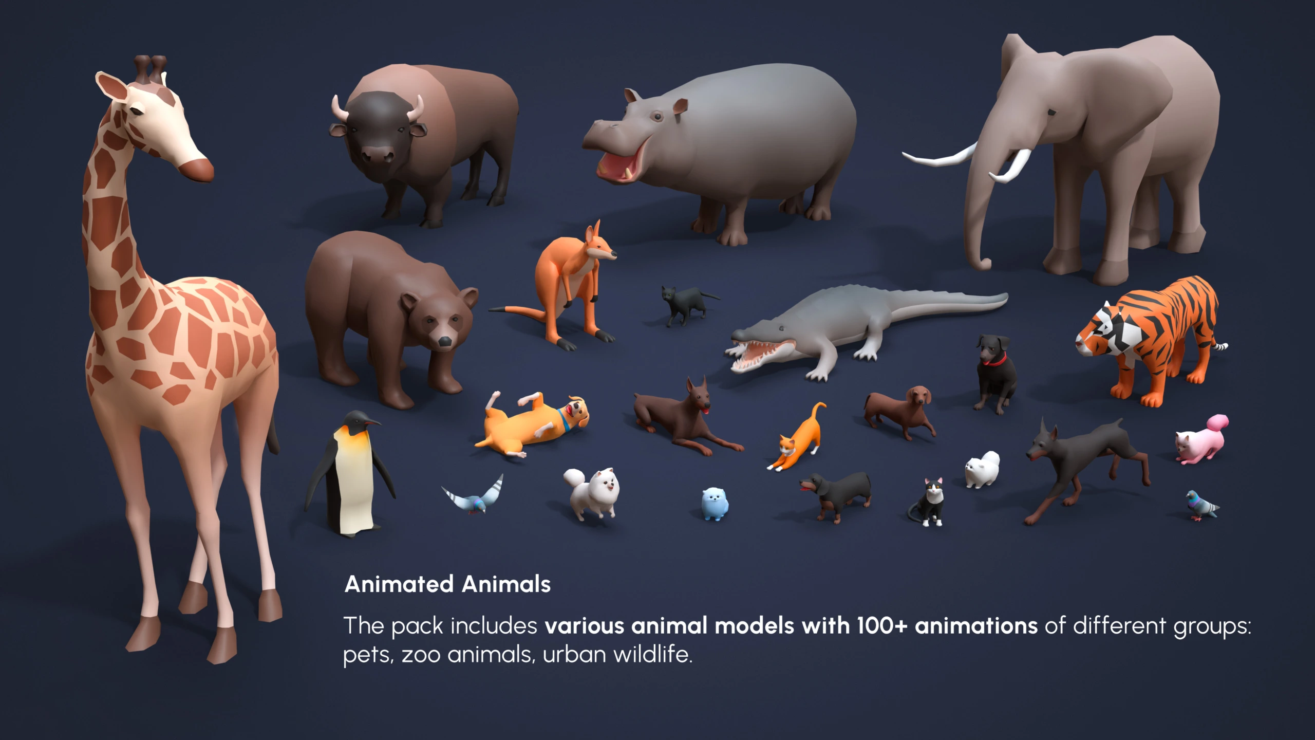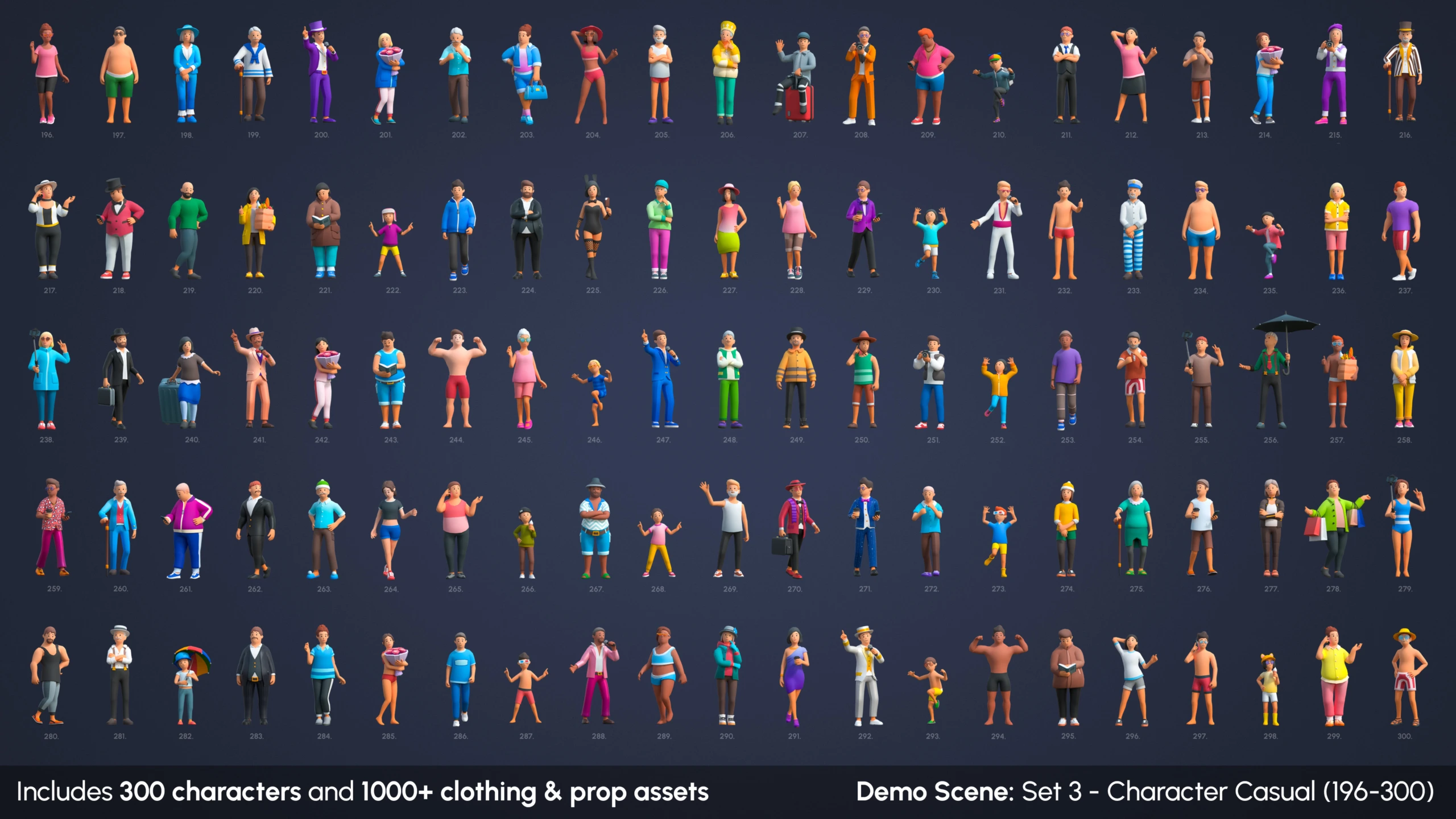 - City Characters Pack: 300 prepared 3D characters of various ages, body types, and skin tones, 1100+ clothing assets, customization tool, movement controller, animations, facial expressions, 100+ props, animals, icons. More detailed description