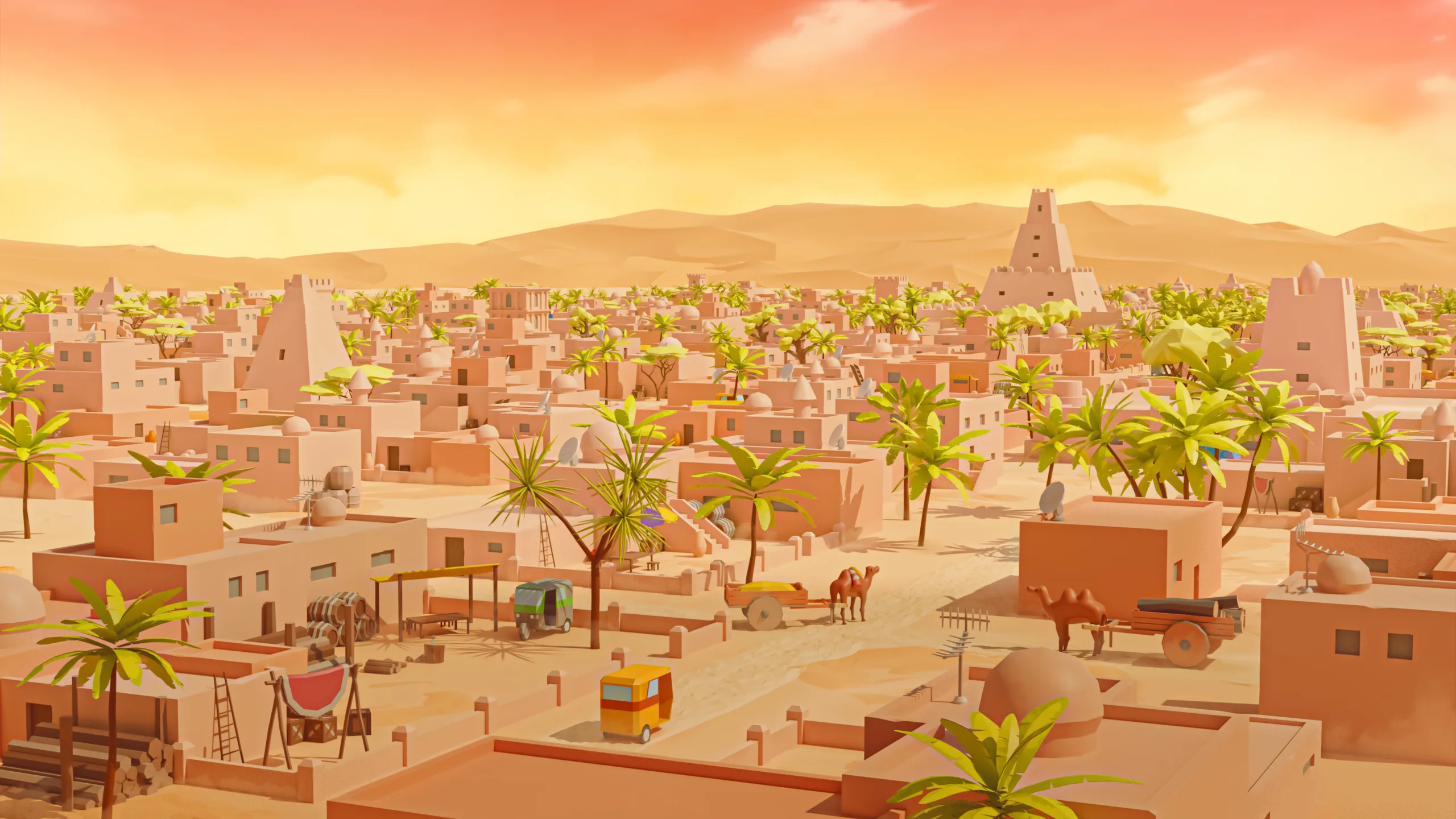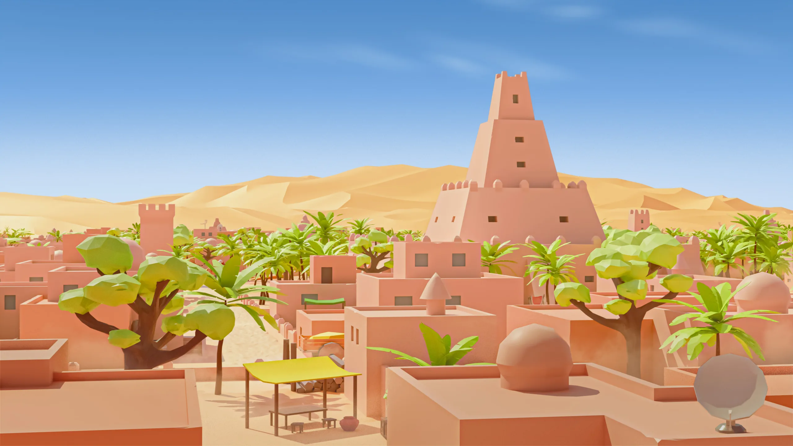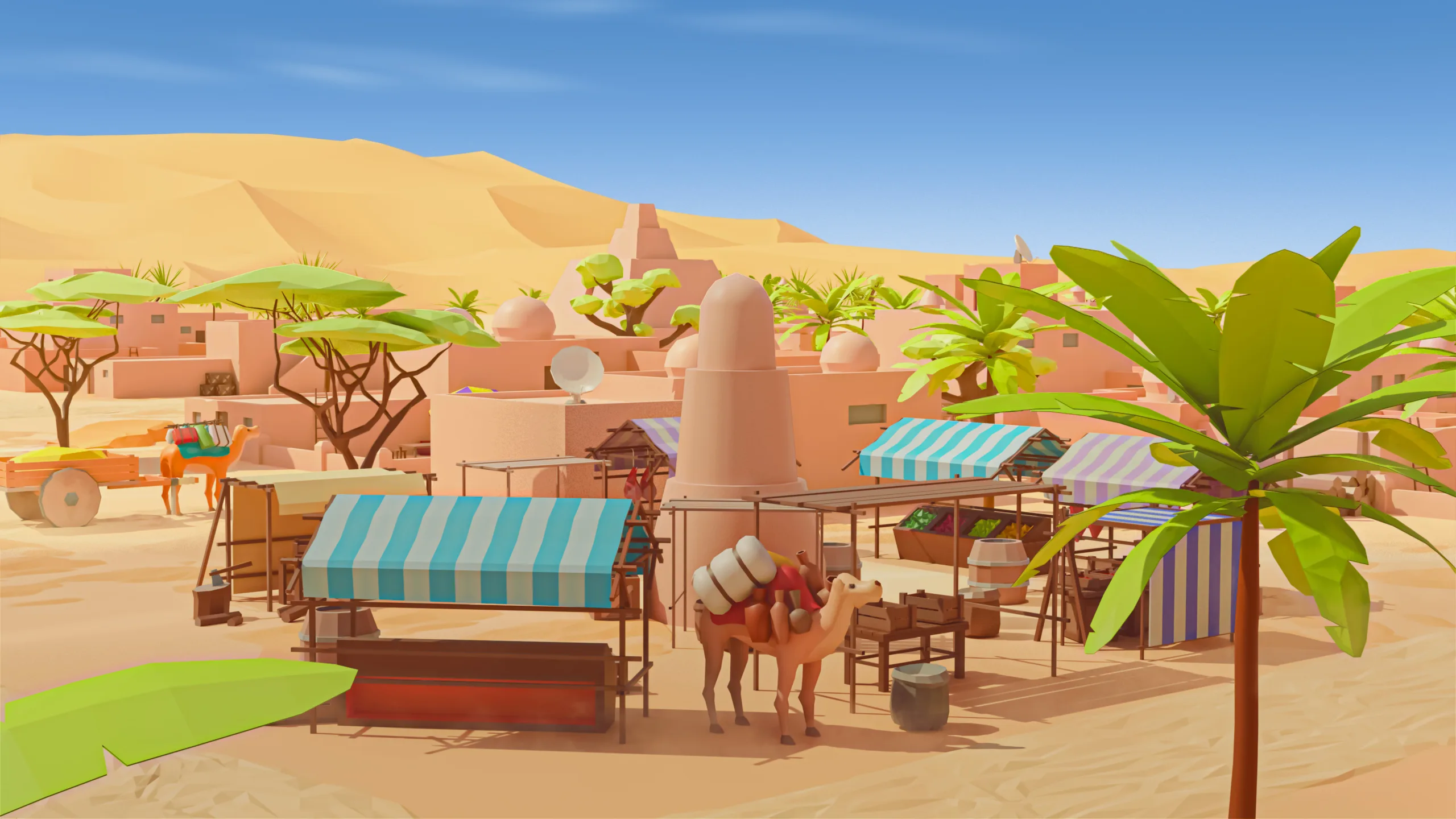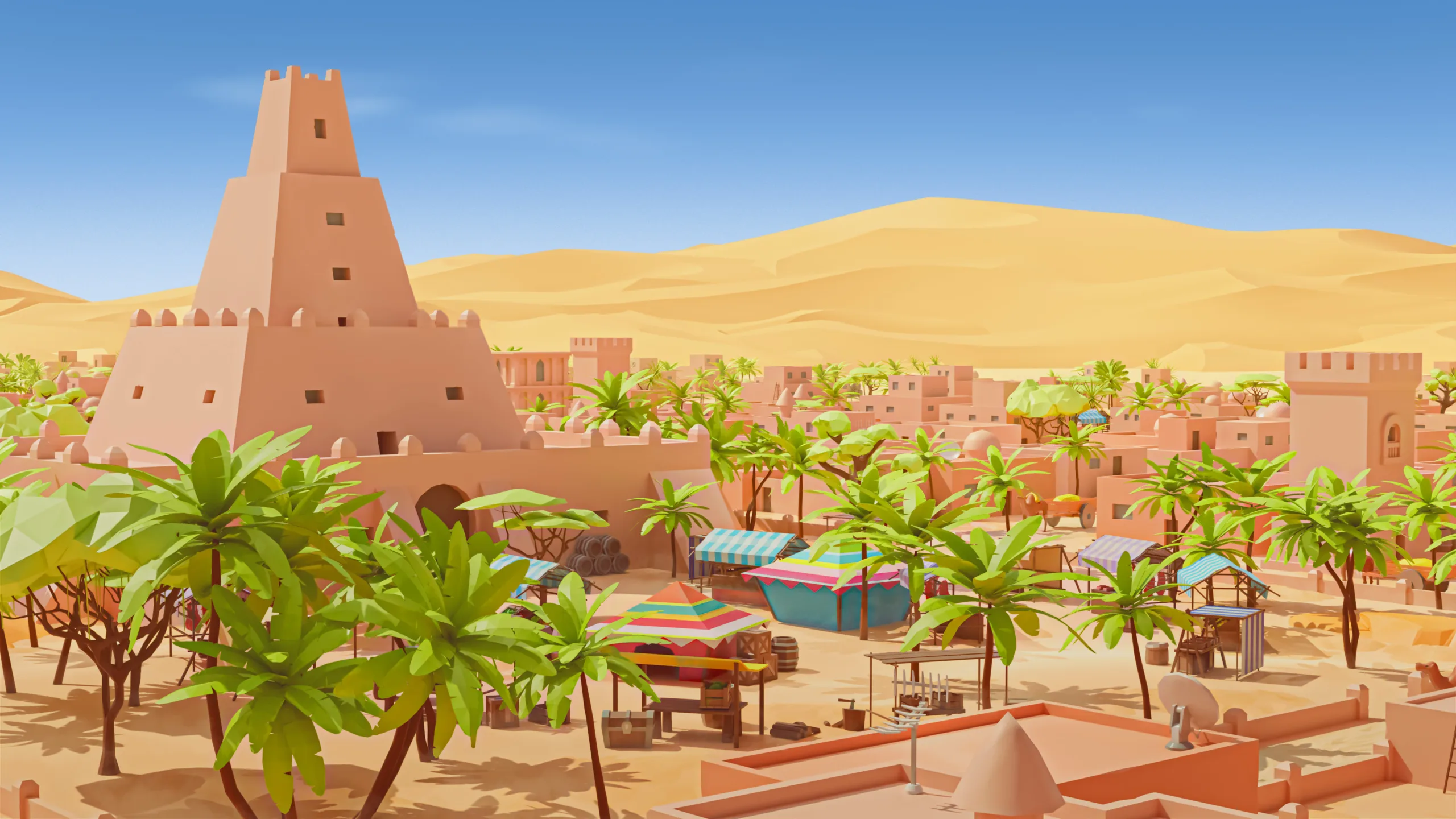 The sand city pack includes a complete set of elements for creating authentic desert environment assets: from monumental stepped towers to small residential houses, from trading tents to environment elements and camel caravans. The thoughtful low poly Arabic city architecture, winding streets with markets, and numerous decorative elements allow for creating both large-scale panoramas of the ancient desert town and atmospheric scenes of urban life, making the pack a versatile tool for developing games or visualizations in the style of ancient desert settlements.