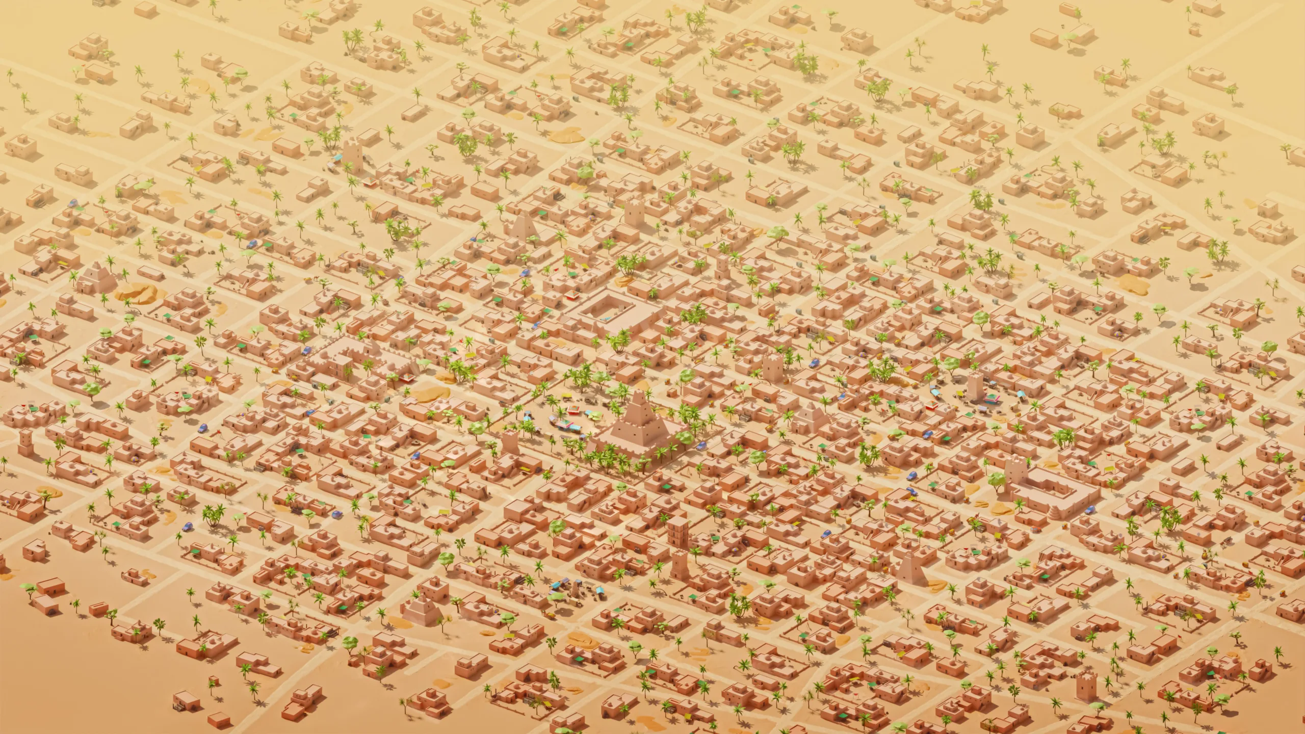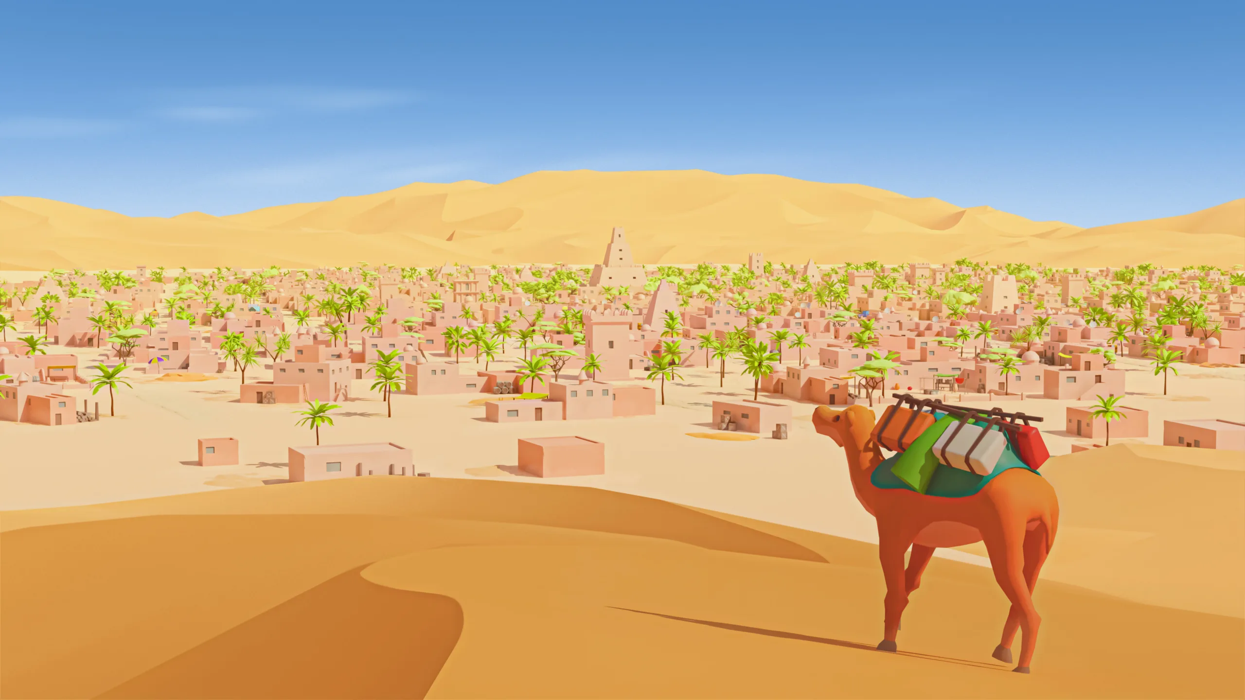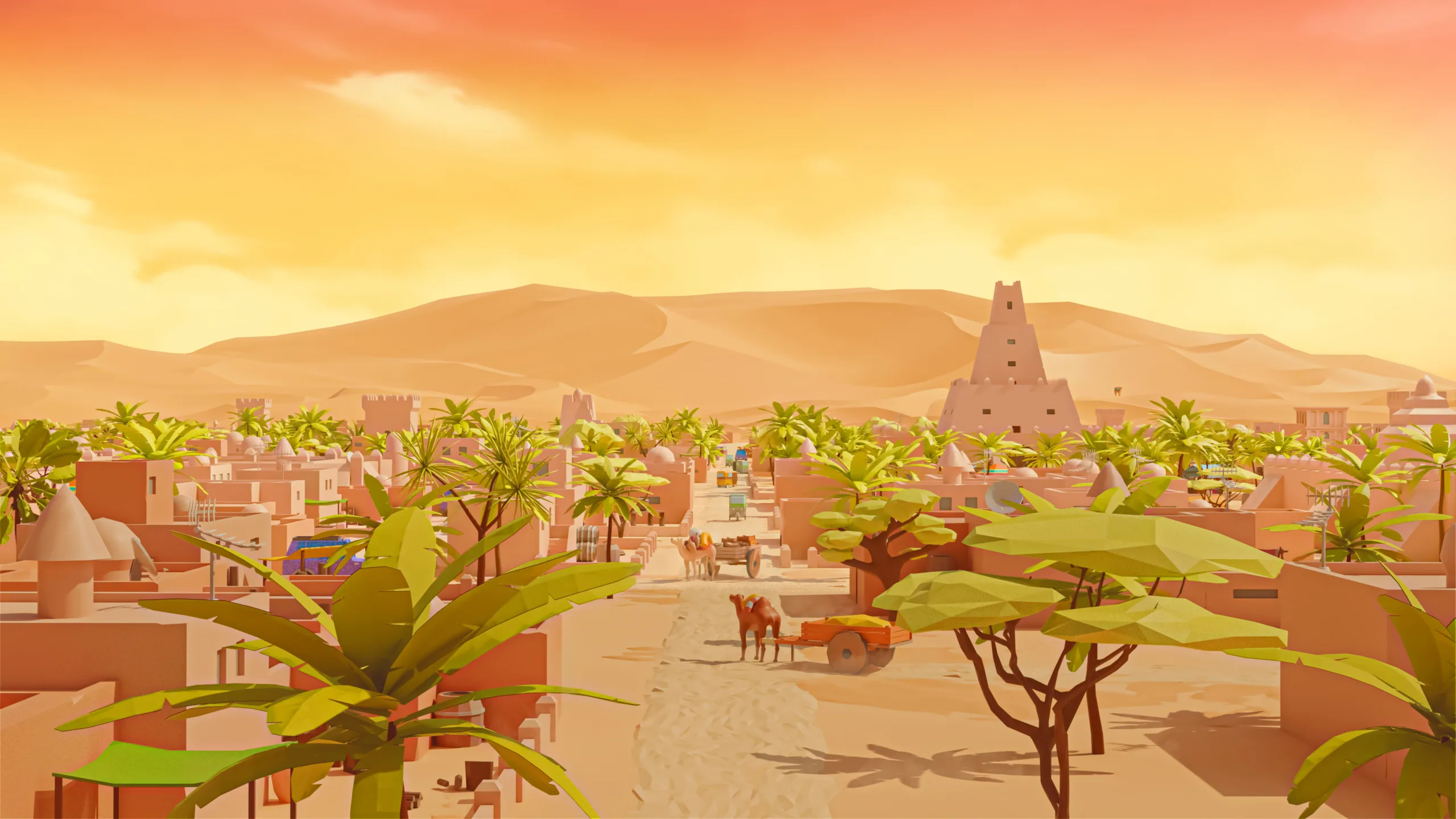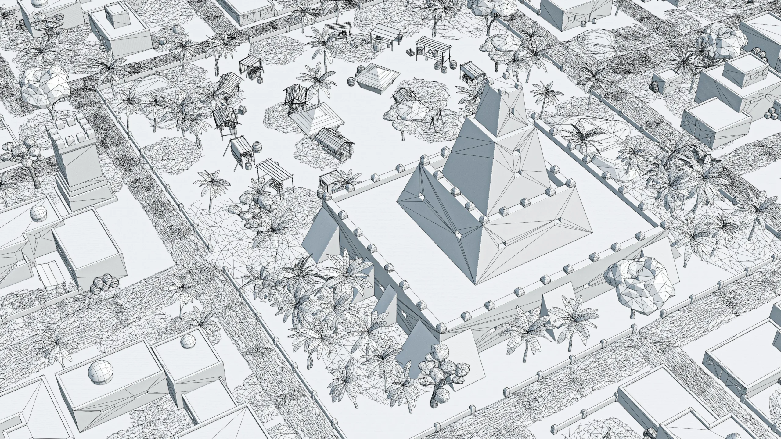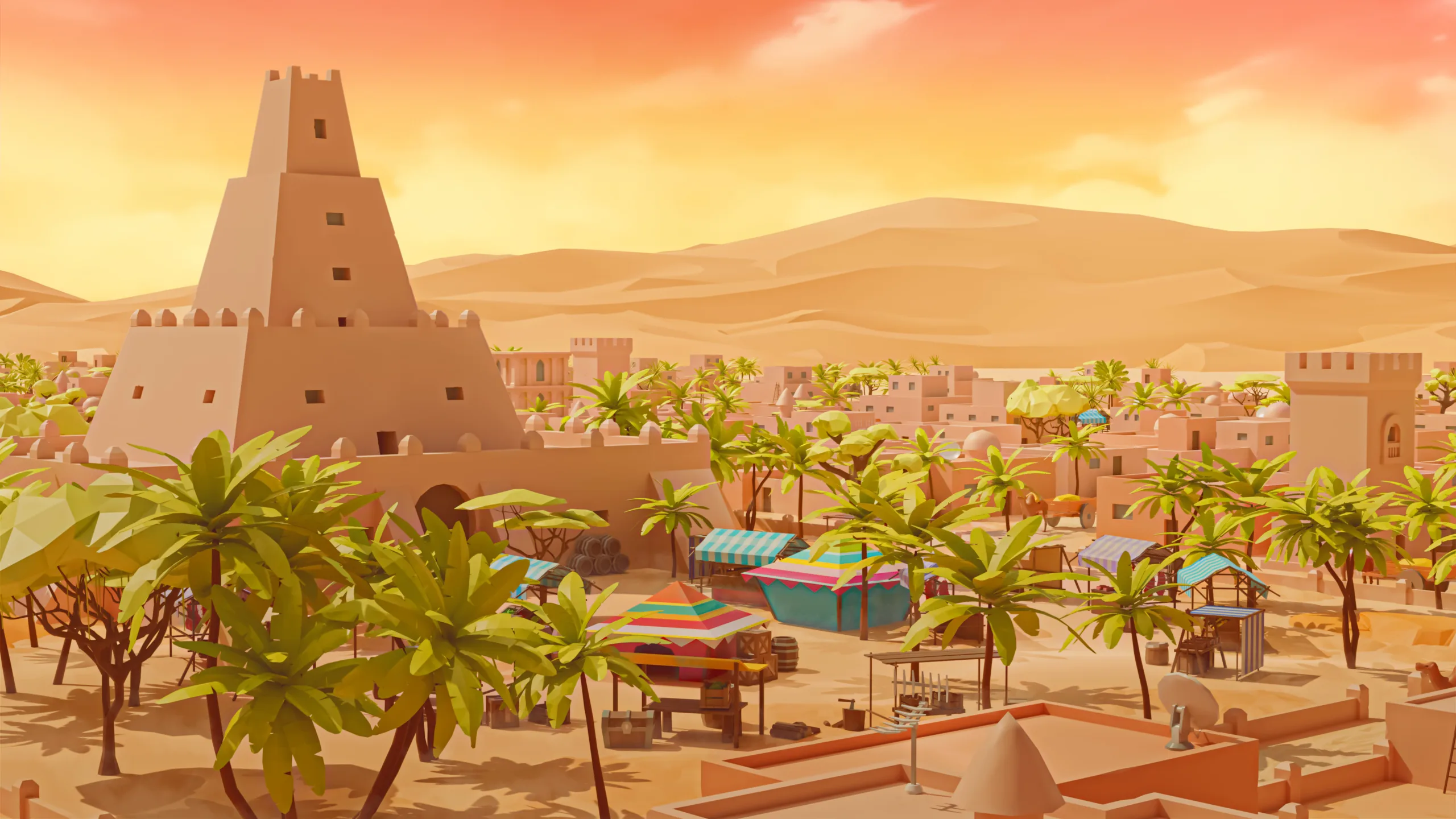 The sand city pack includes a complete set of elements for creating authentic desert environment assets: from monumental stepped towers to small residential houses, from trading tents to environment elements and camel caravans. The thoughtful low poly Arabic city architecture, winding streets with markets, and numerous decorative elements allow for creating both large-scale panoramas of the ancient desert town and atmospheric scenes of urban life, making the pack a versatile tool for developing games or visualizations in the style of ancient desert settlements.