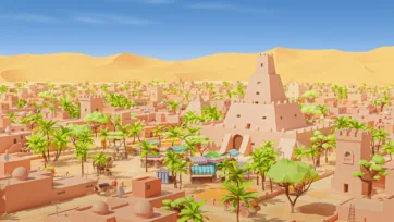 This unique “Desert City Sands” 3D model pack recreates the atmosphere of an ancient desert town with its distinctive architecture, bustling marketplaces, and caravan routes. The stylized low-poly graphics combined with a warm color palette of sandy shades, where the pastel tones of buildings harmoniously complement the bright accents of market awnings and lush palm greenery in this Arabic village models collection, adds special expressiveness.