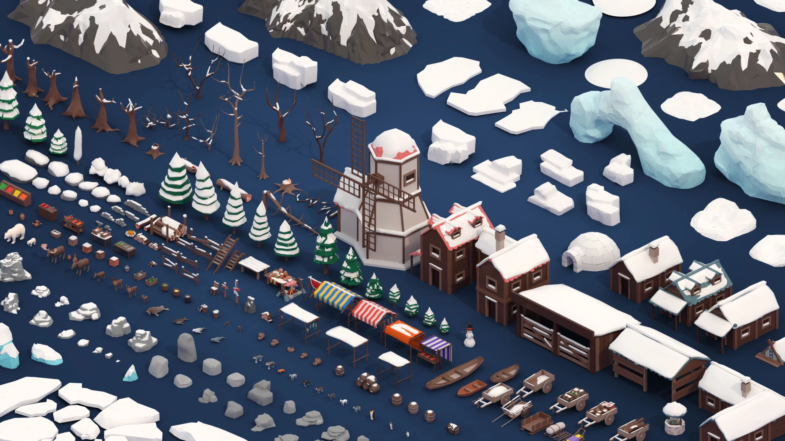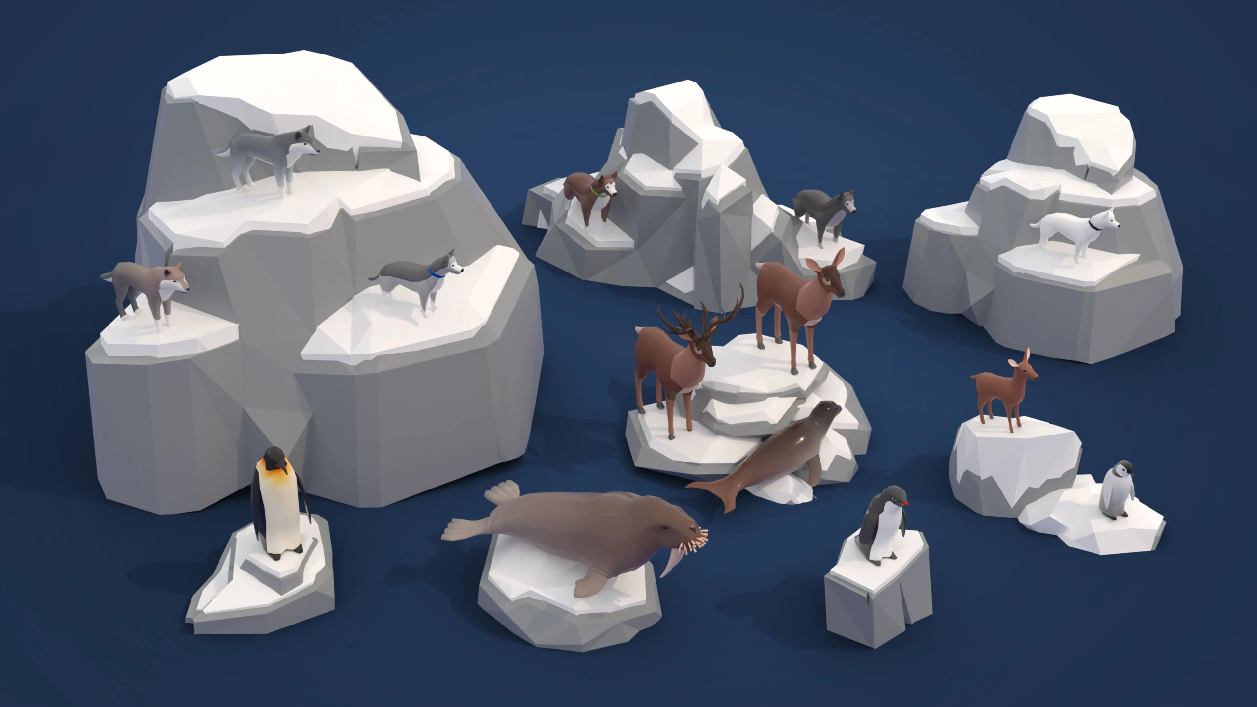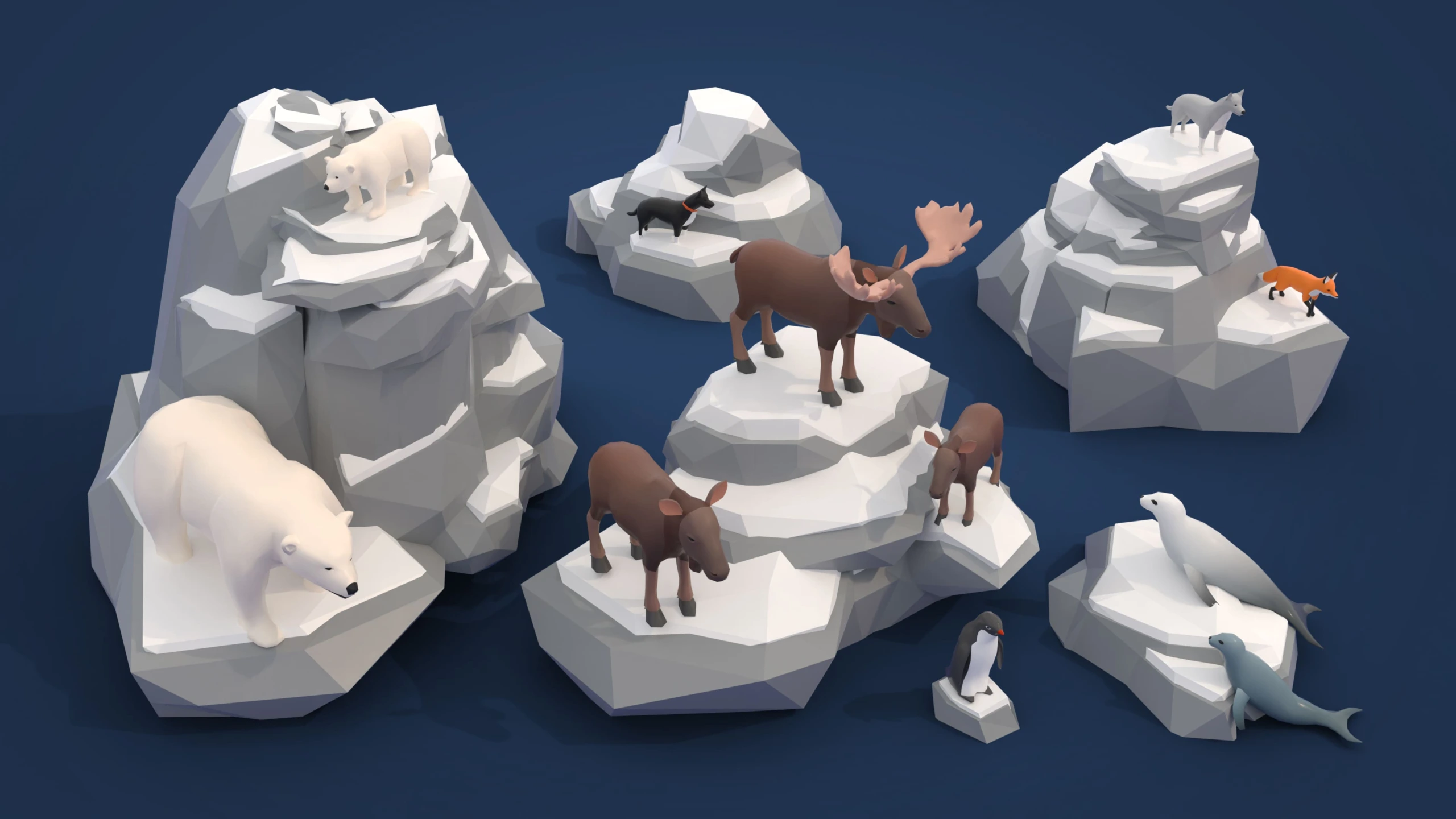 Explore the frozen beauty of the Arctic with our meticulously crafted 3D asset pack designed for game engines. Arctic offers a comprehensive collection of 262 low-poly arctic models including captivating animals, immersive landscapes, quaint buildings, lush vegetation, and versatile props. From majestic polar bears to rustic igloos, our assets provide limitless possibilities for creating unique and captivating game environments.