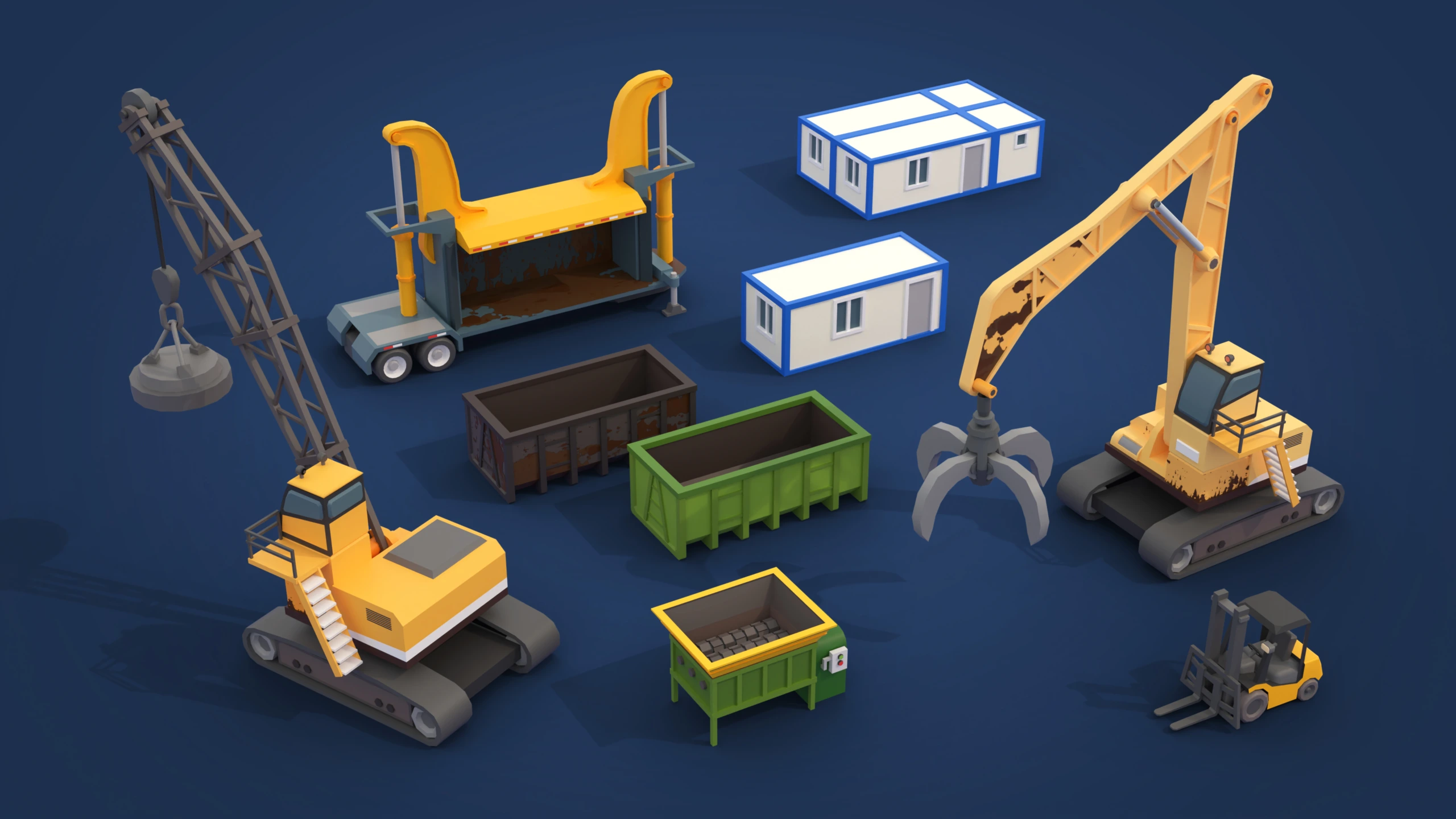 5 industrial machines (forklift, claw crane, magnet crane, car press, shredder)