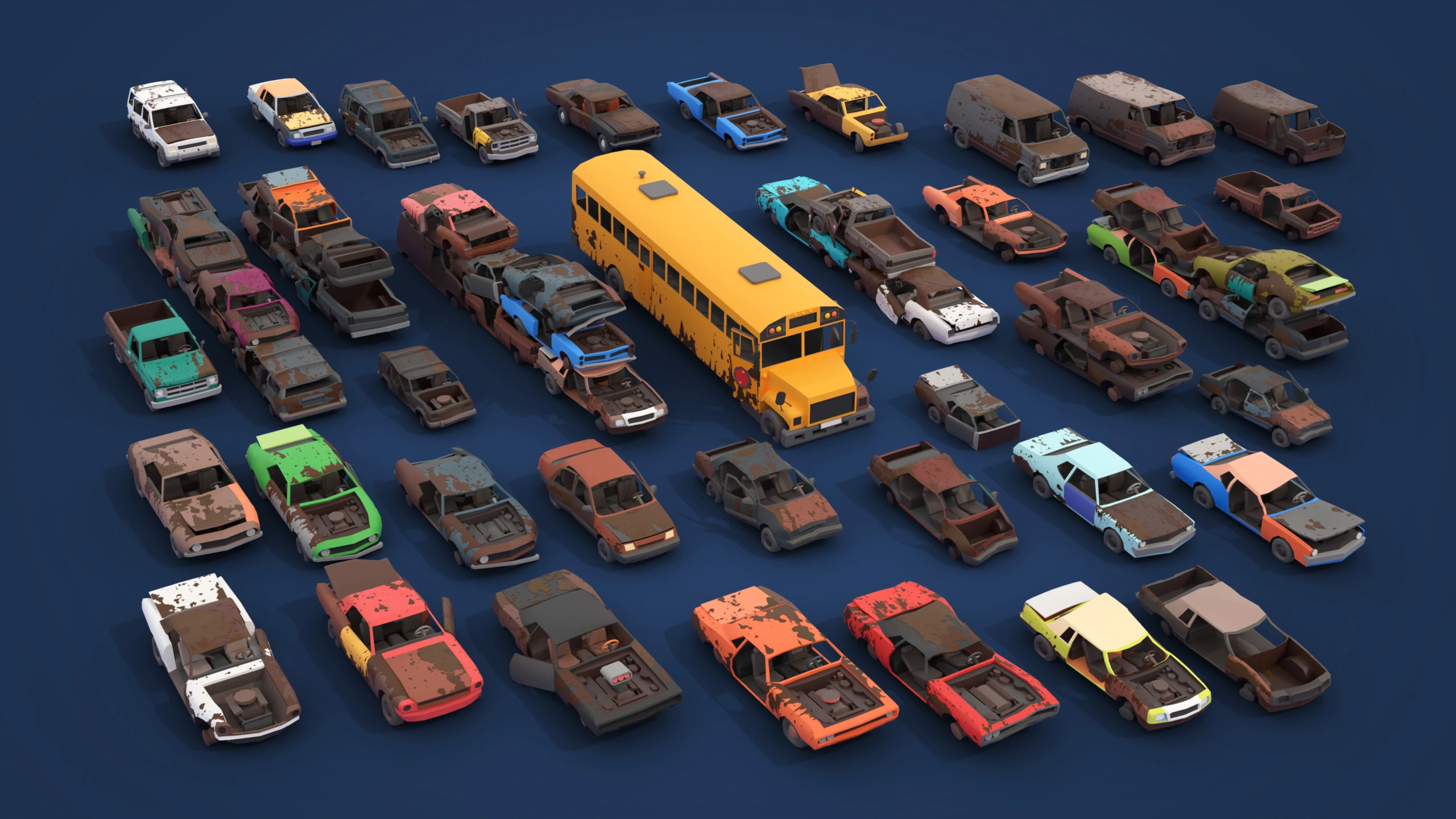 37 detailed junkyard model cars (school bus, minibus, pickup, SUV, muscle car, retro car)