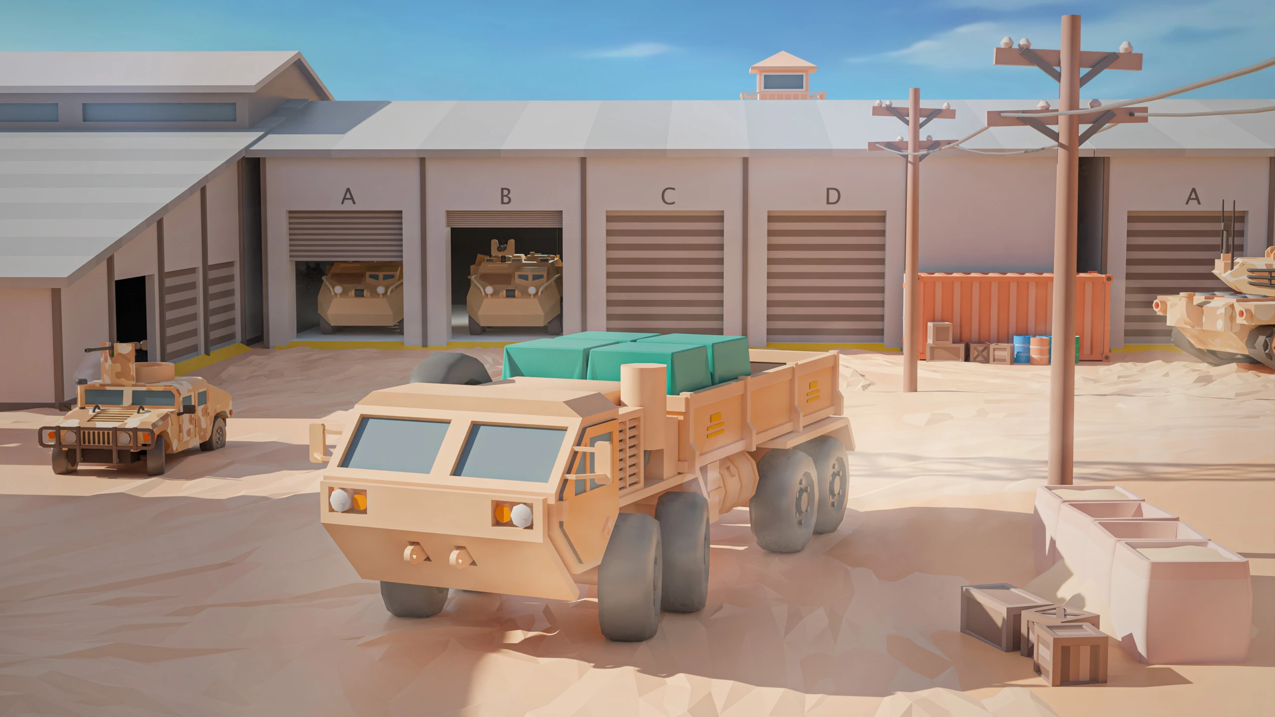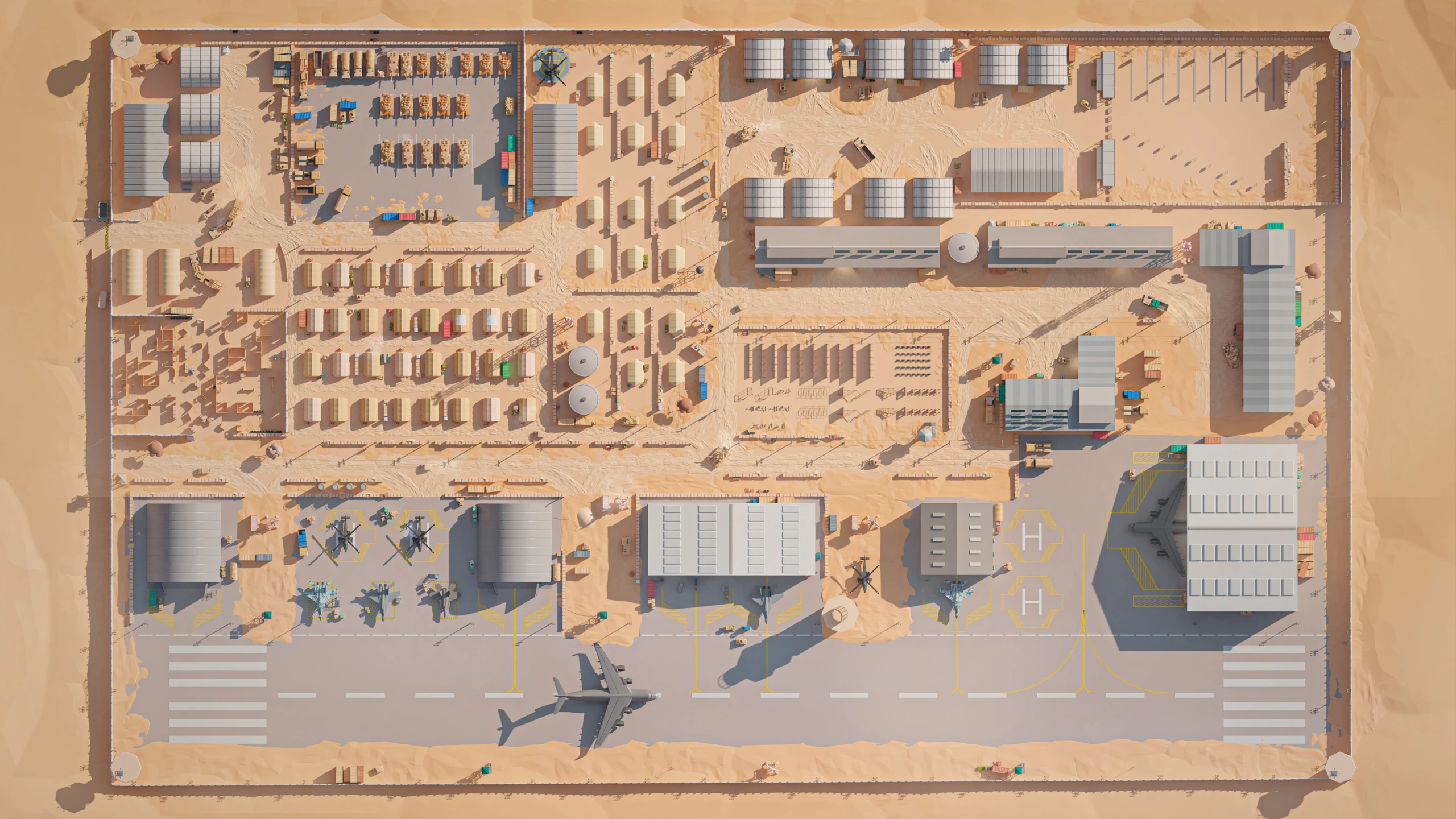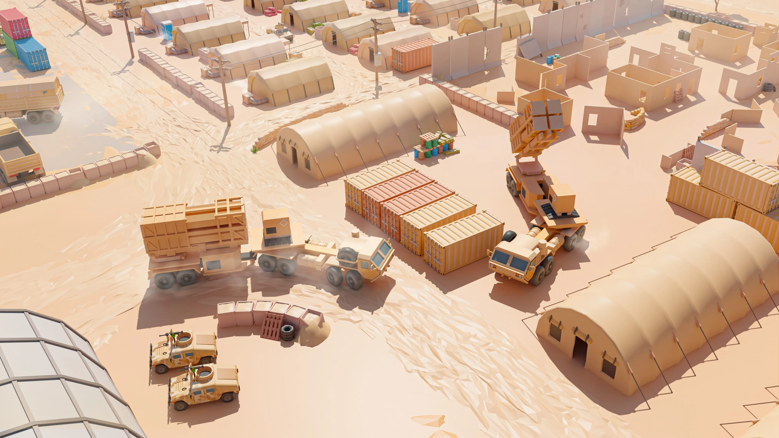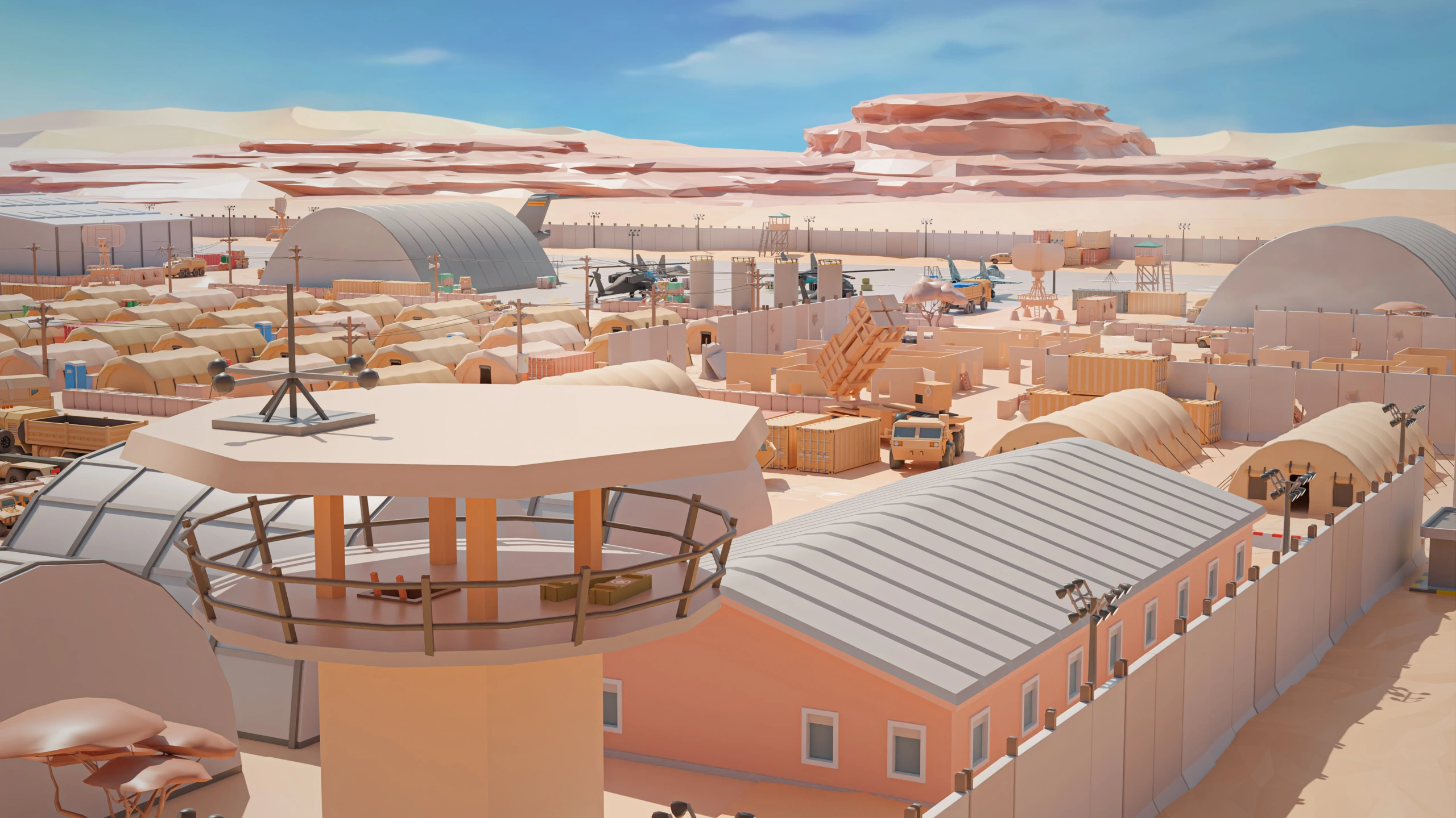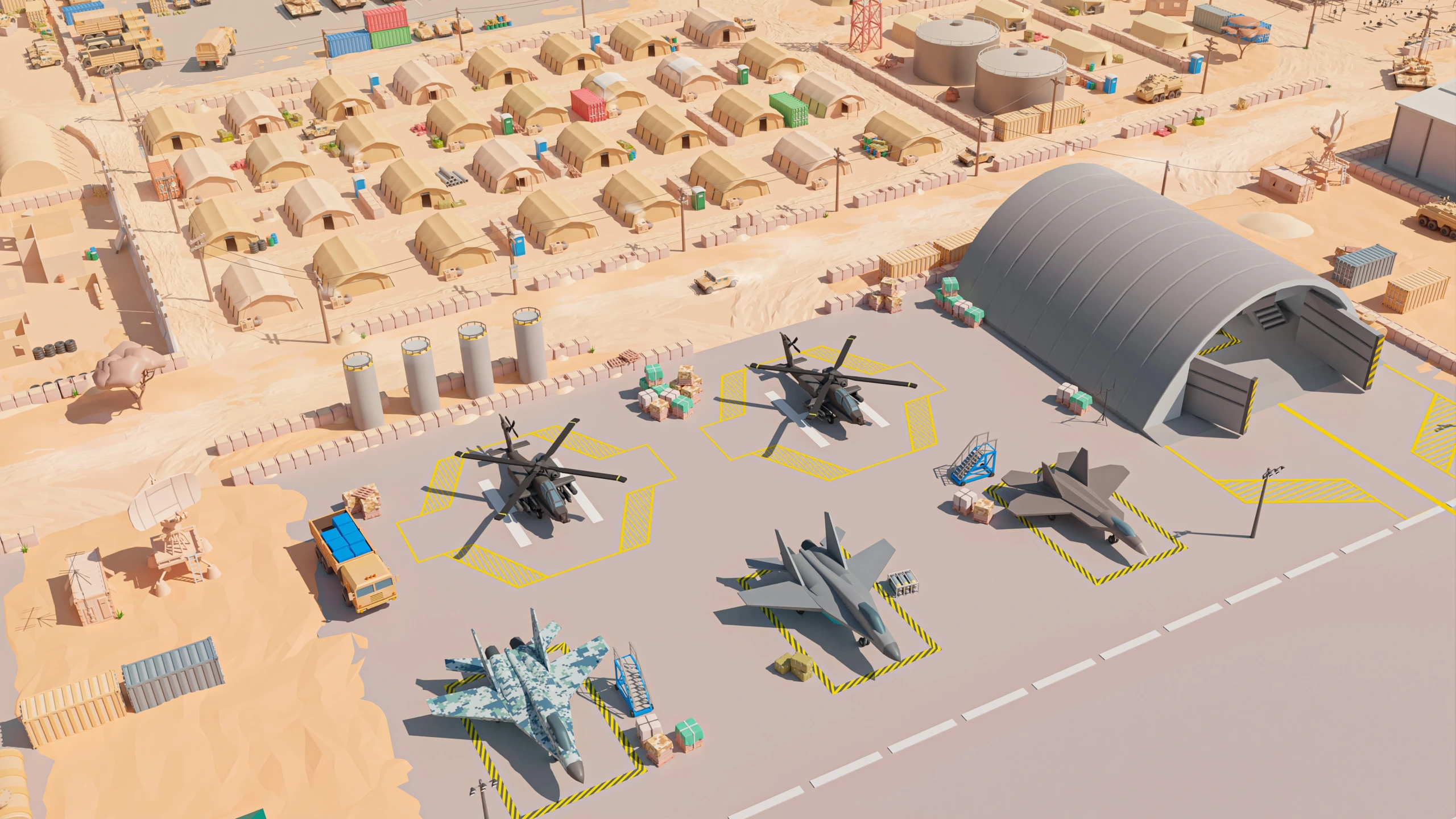Military Desert – A military base in the desert. The vehicles have yellow-sand desert camouflage (Desert MERDC/3-color Desert).