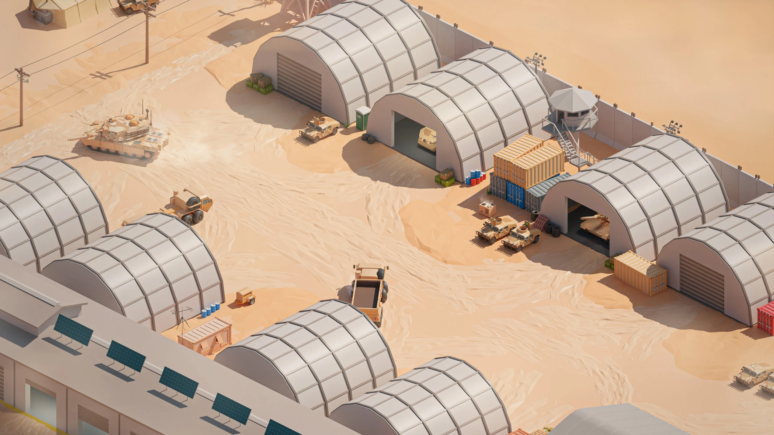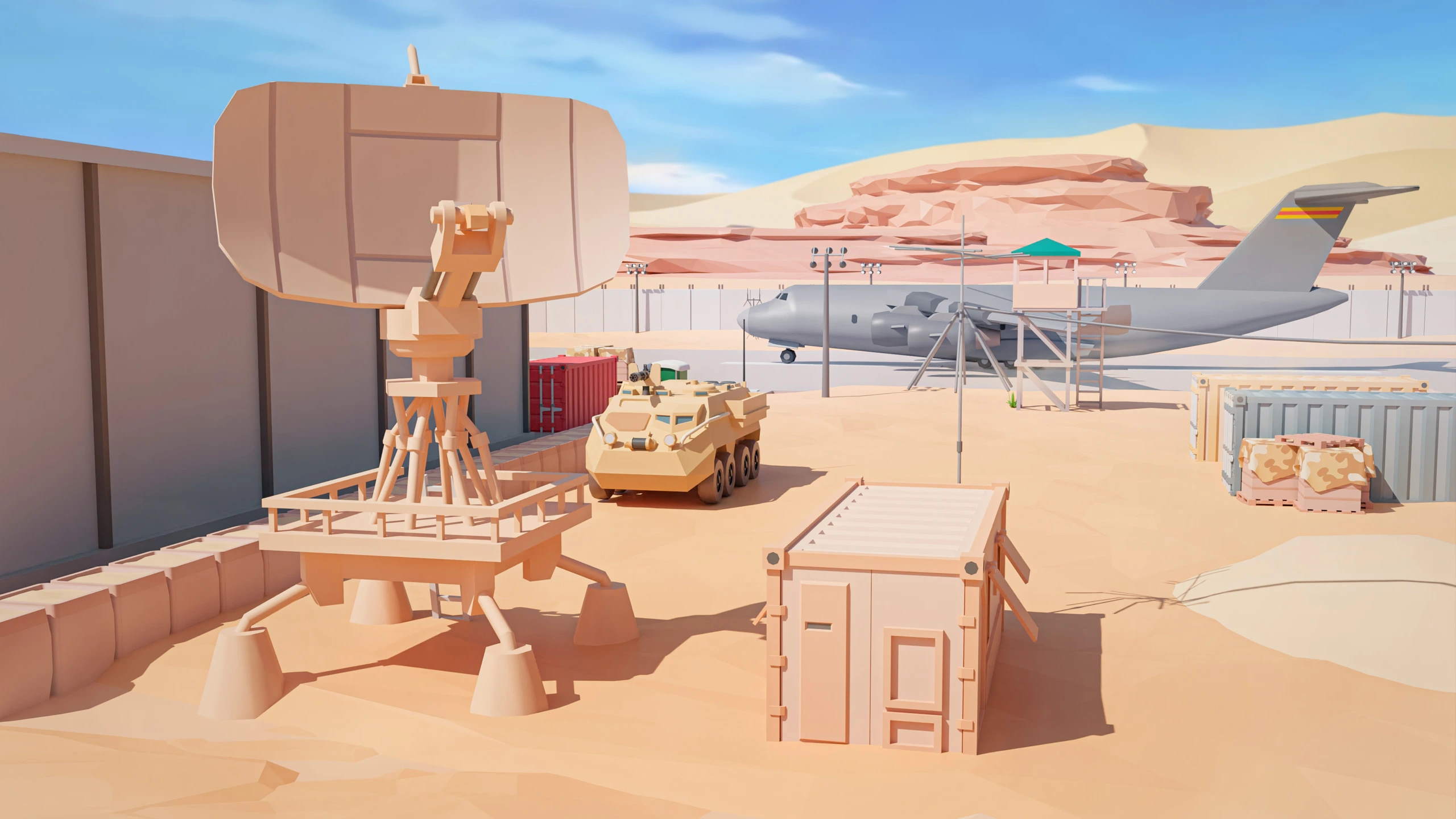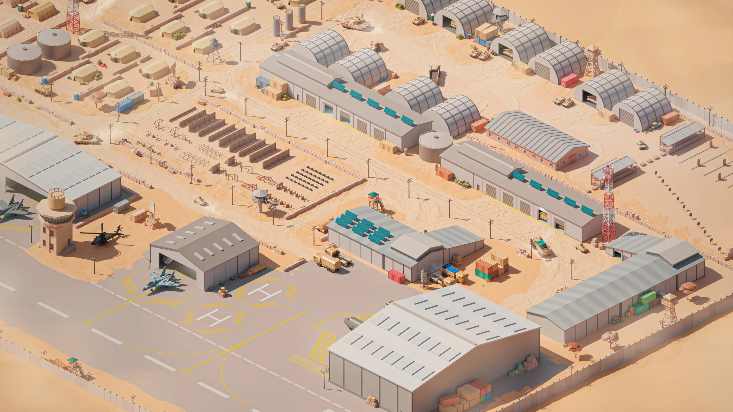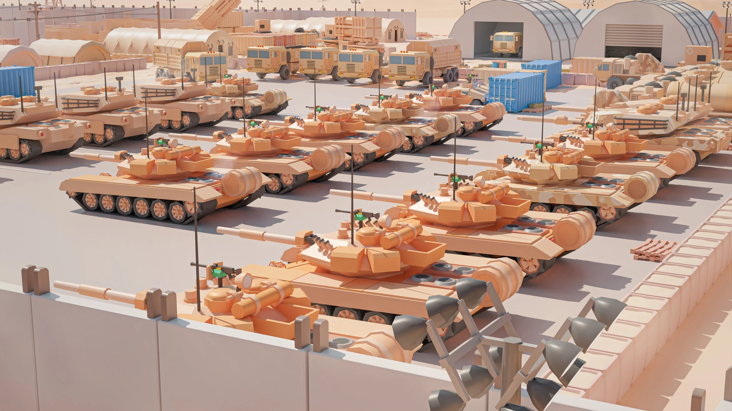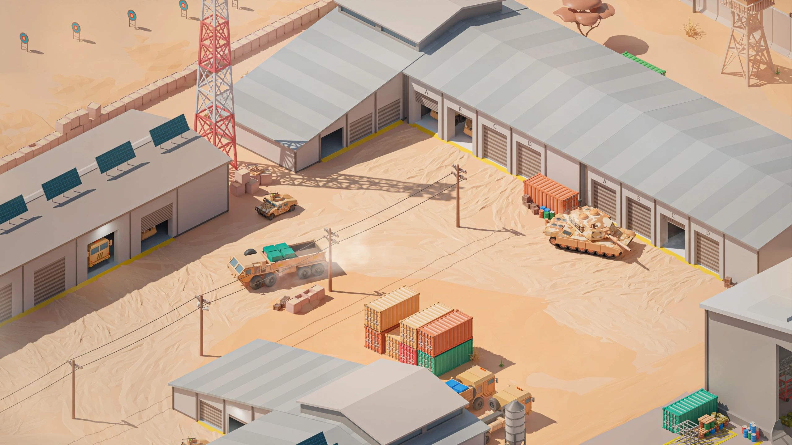 Military Desert – A military base in the desert. The vehicles have yellow-sand desert camouflage (Desert MERDC/3-color Desert).