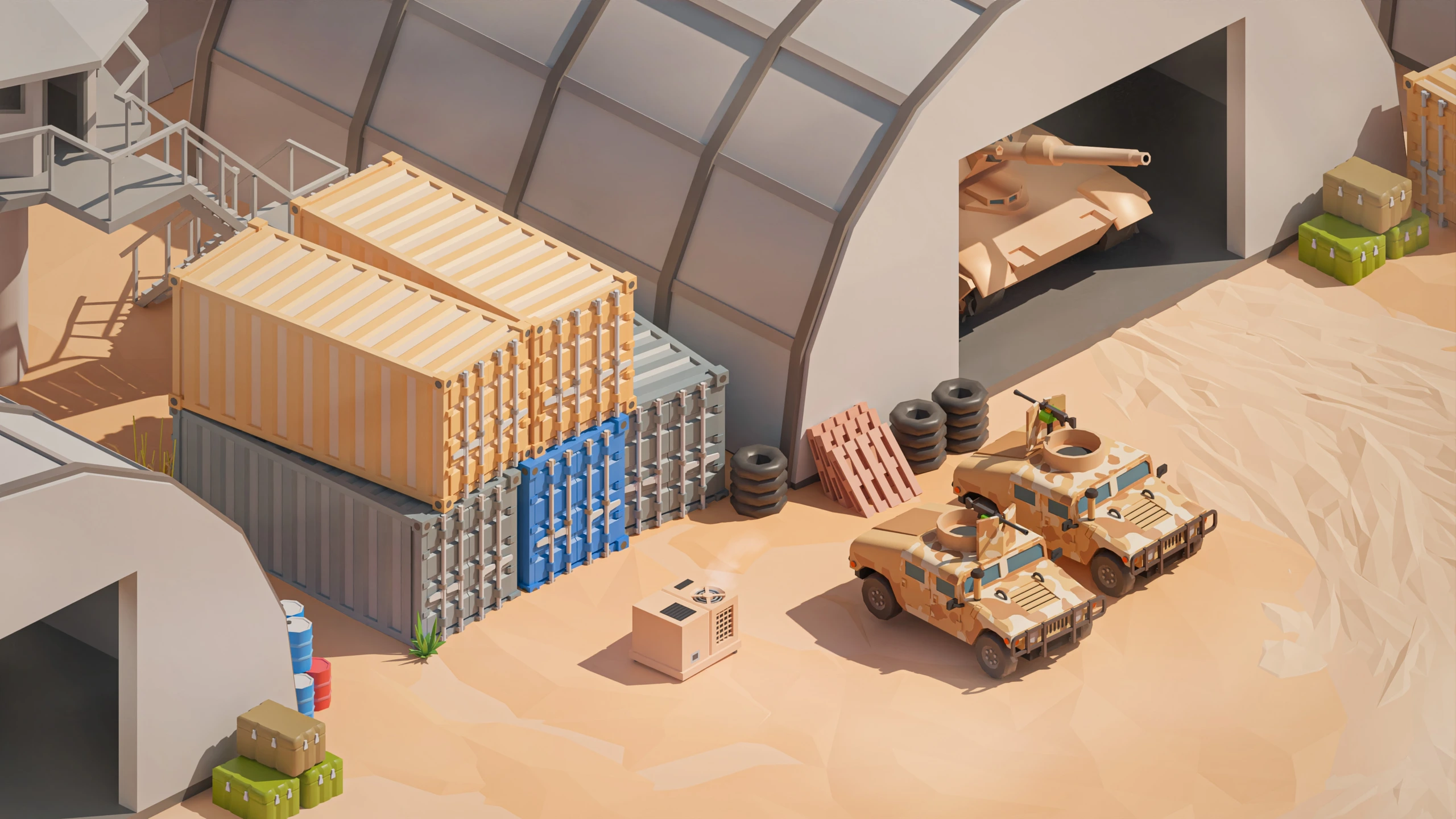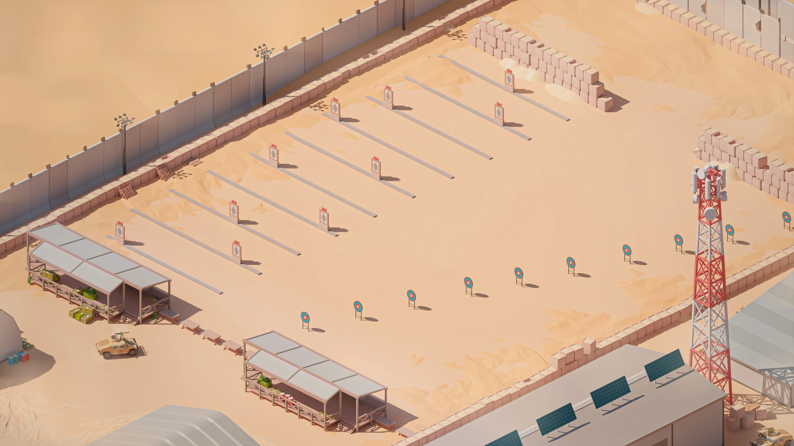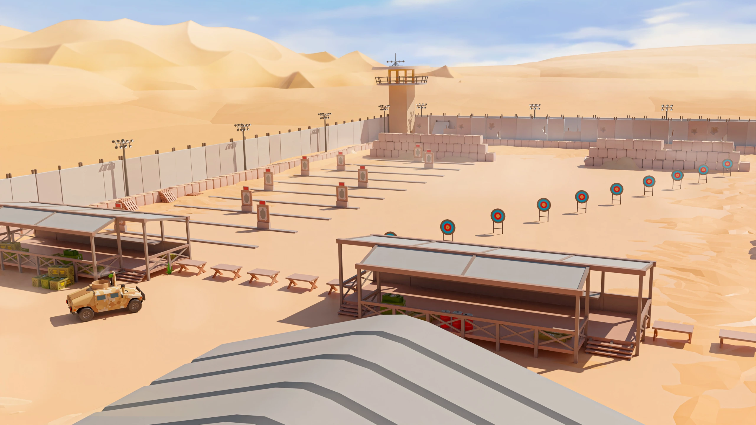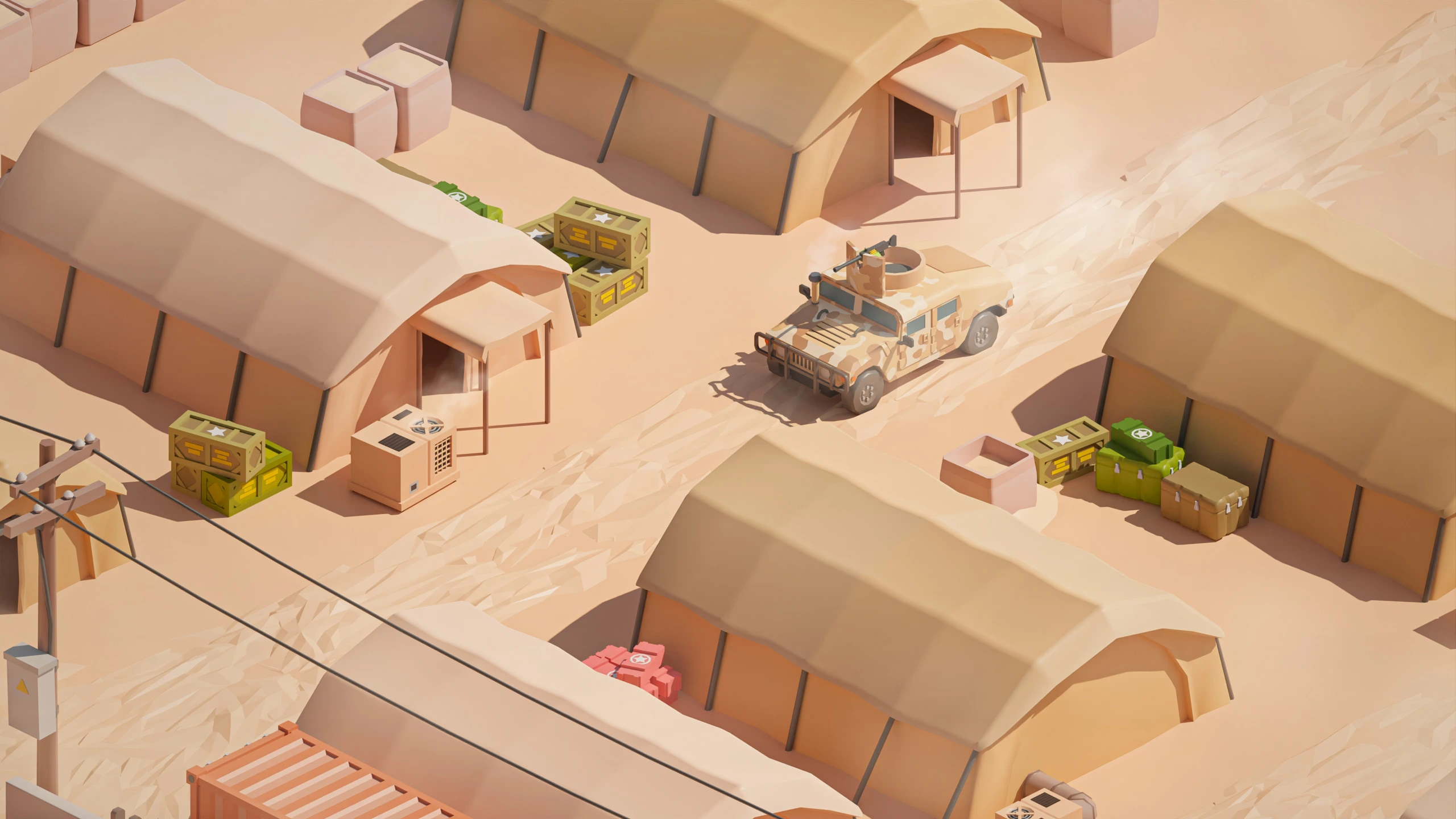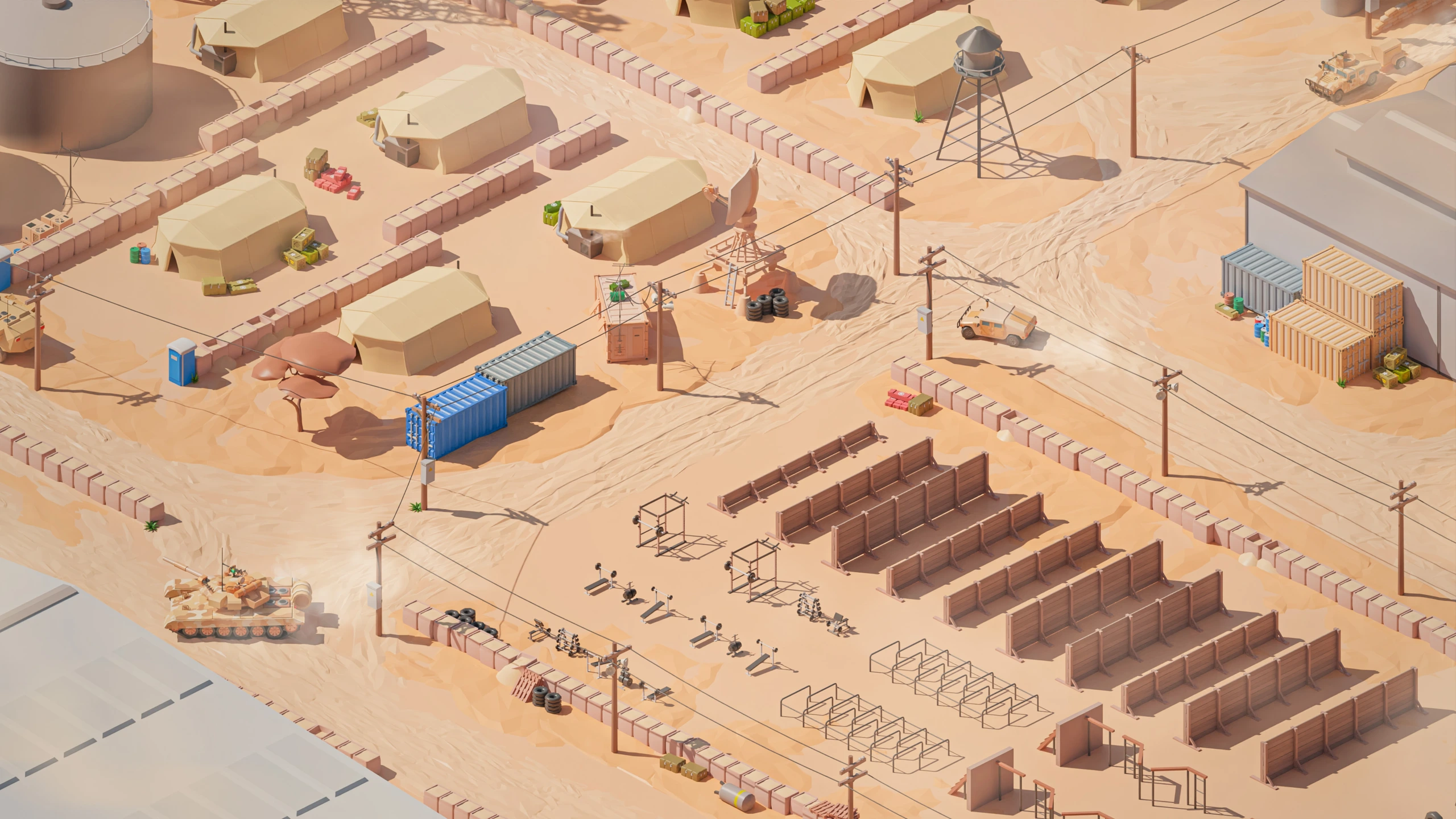 Military Desert – A military base in the desert. The vehicles have yellow-sand desert camouflage (Desert MERDC/3-color Desert).