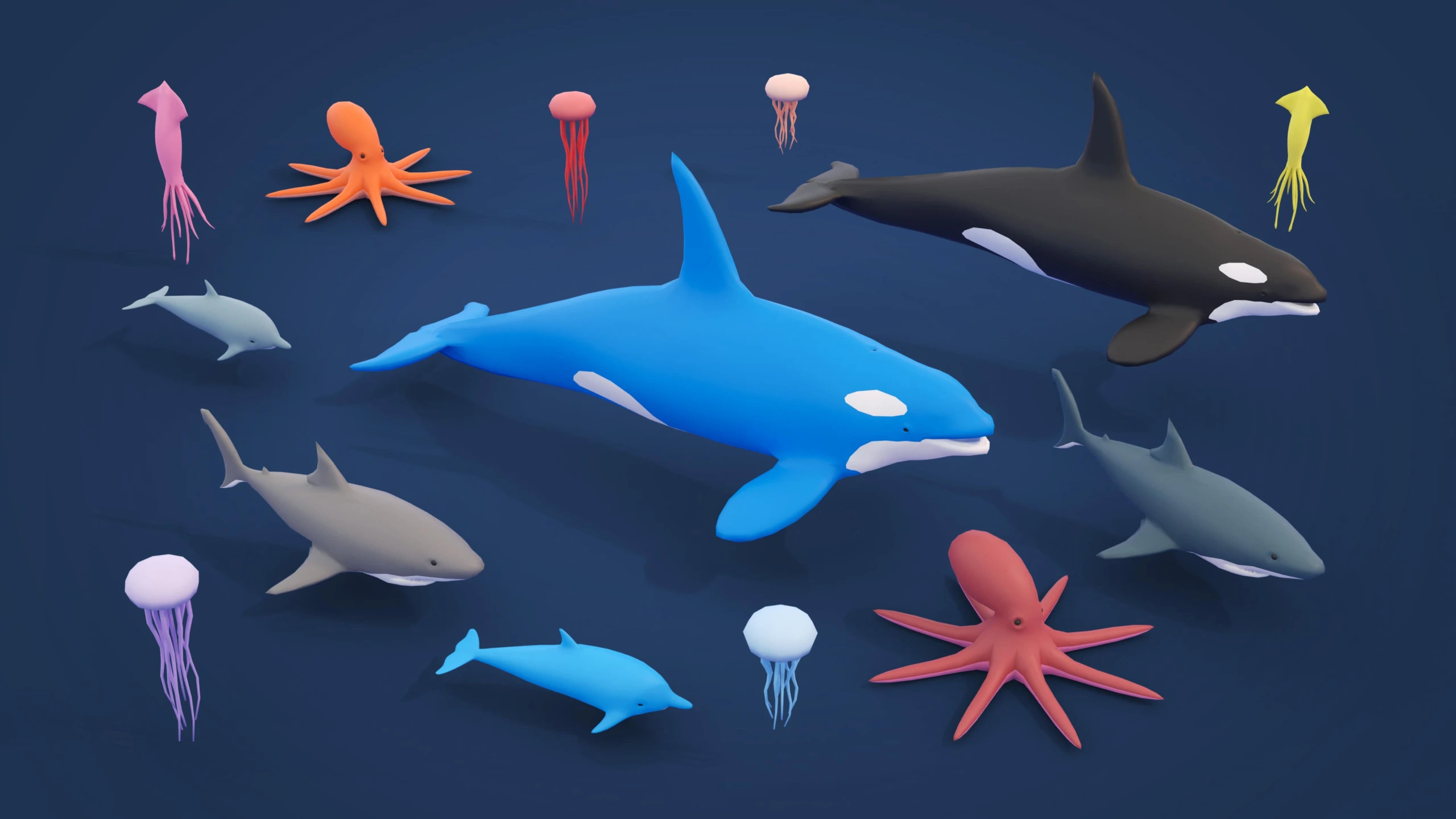 - 68 Fishes: Whale, orca, shark, dolphin, jellyfish, squid, octopus, turtle, crab, ray, fish, etc.