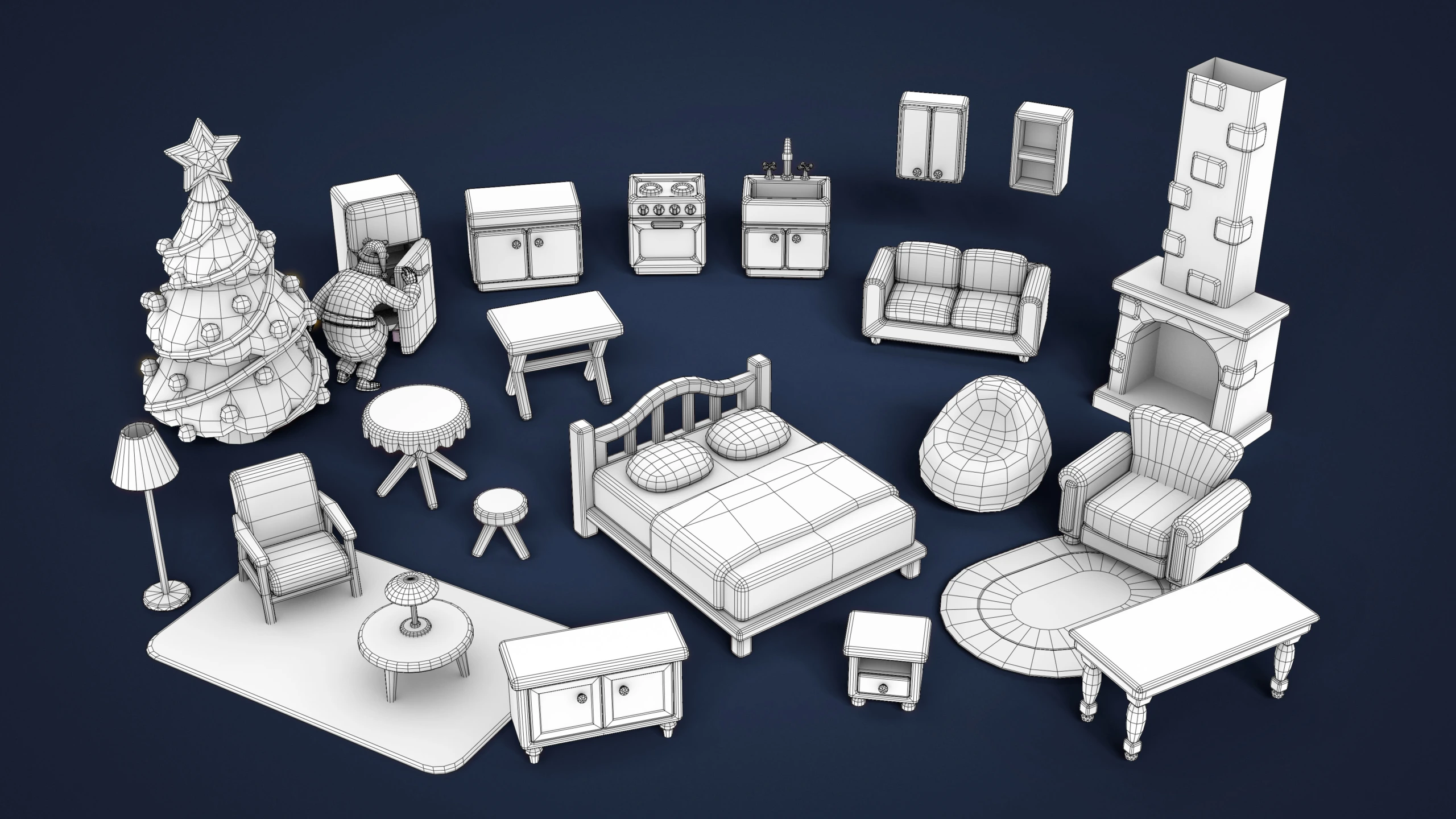 - Furniture & Interior: Bed, sofa, armchair, tables, nightstands, cabinets, kitchen furniture, stove, sink, lamps, rugs, bean bag.
