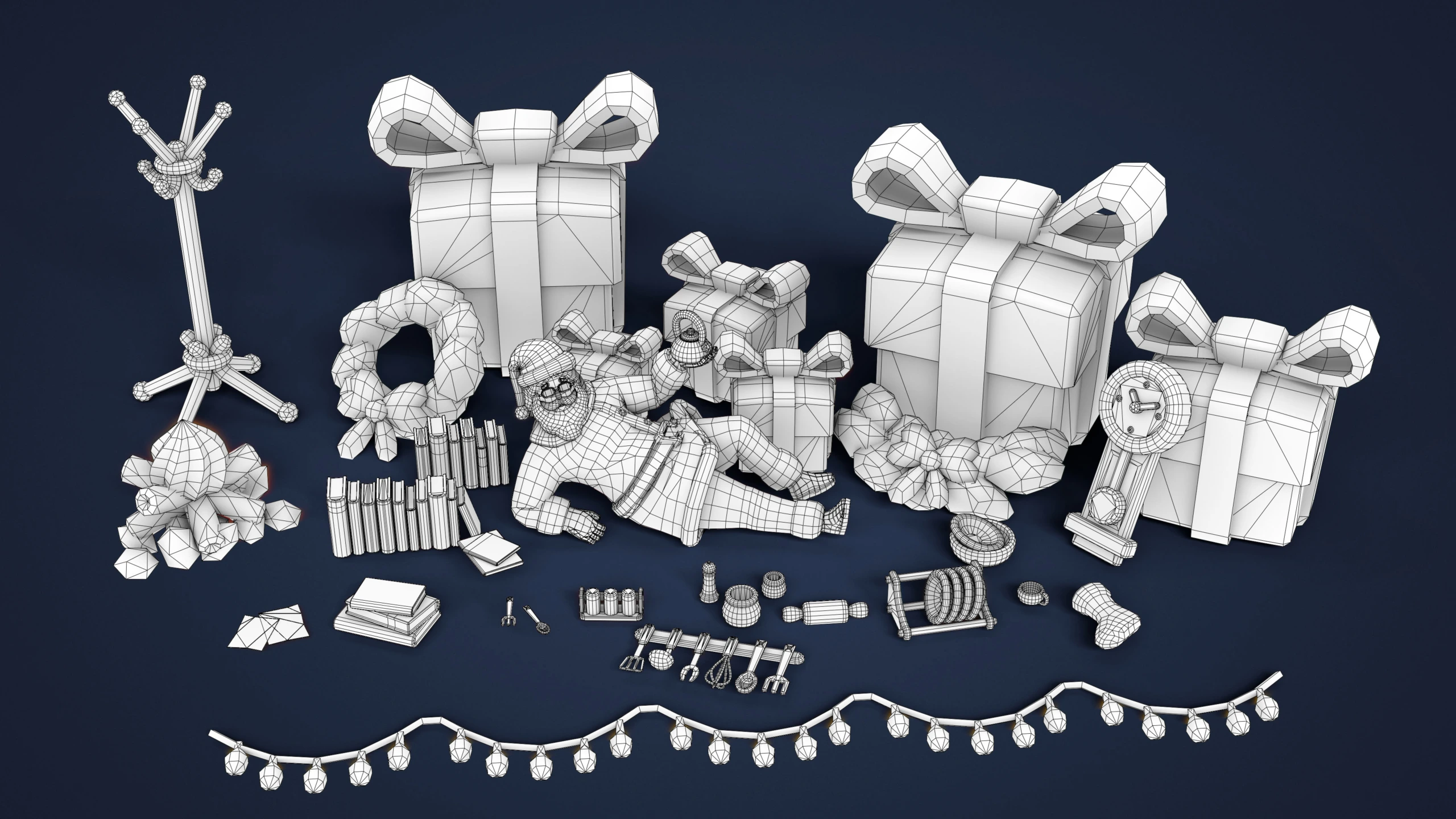 Polygon Count: 121K triangles (945 per model). Santa with full outfit has 13.6k tris.
