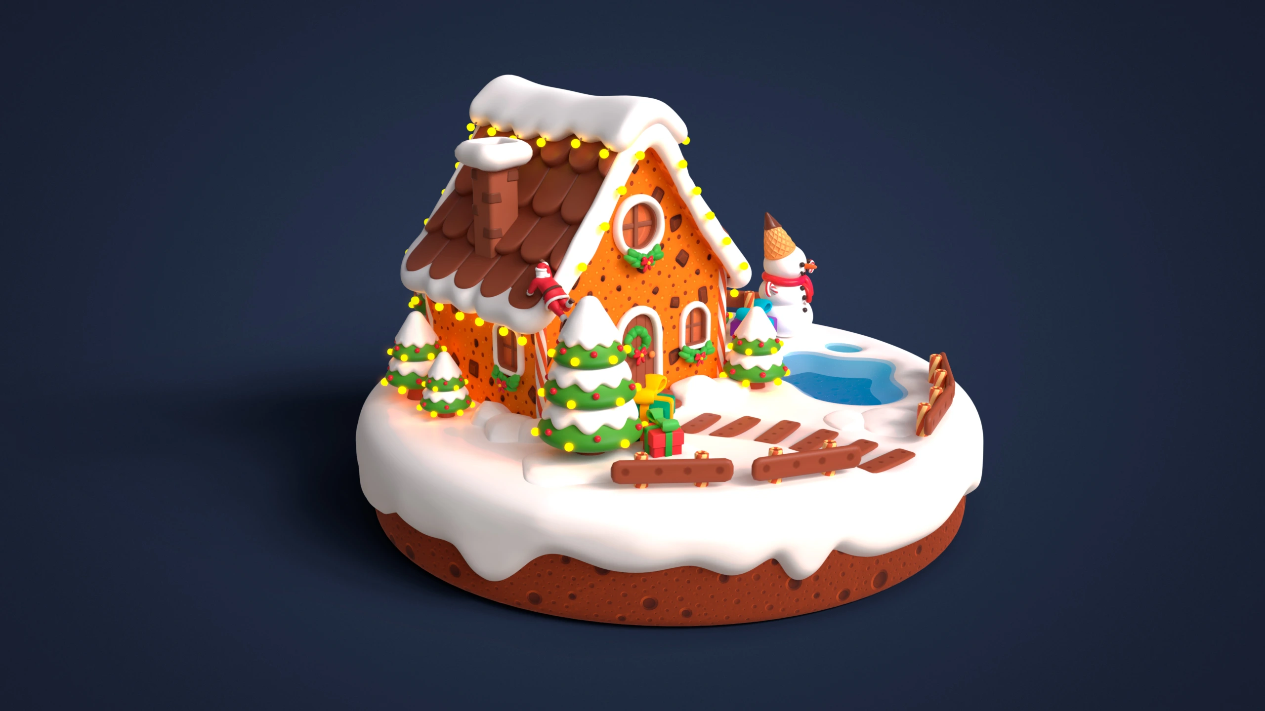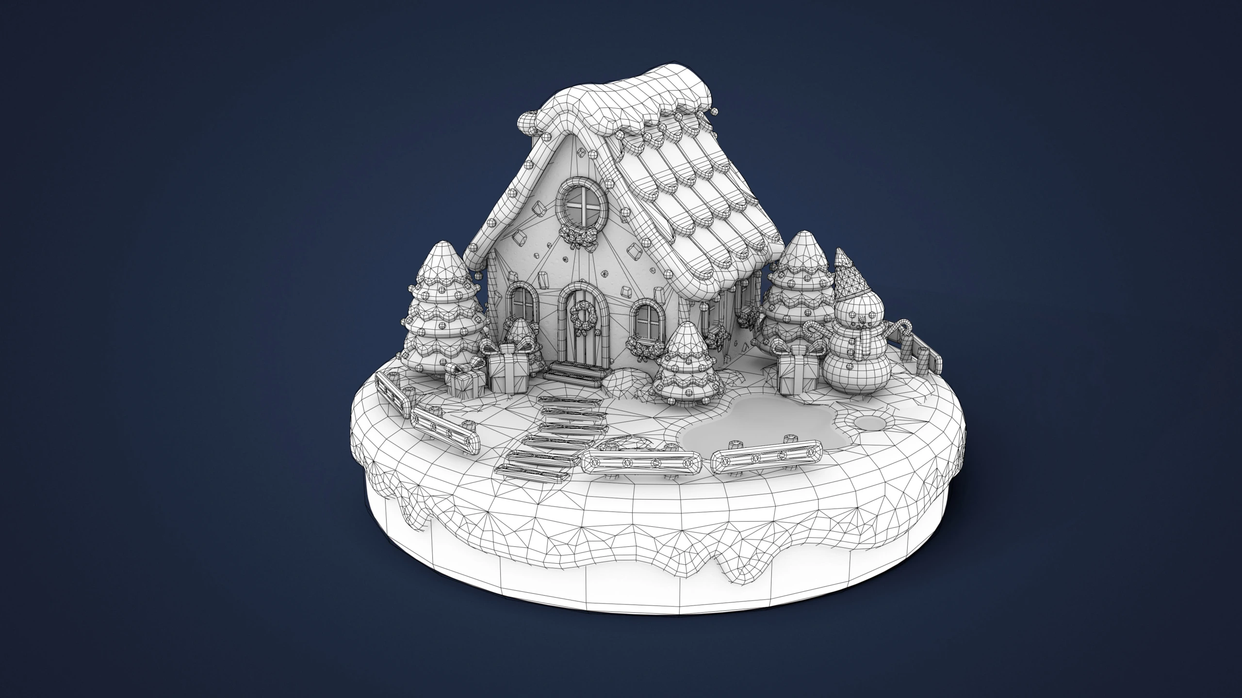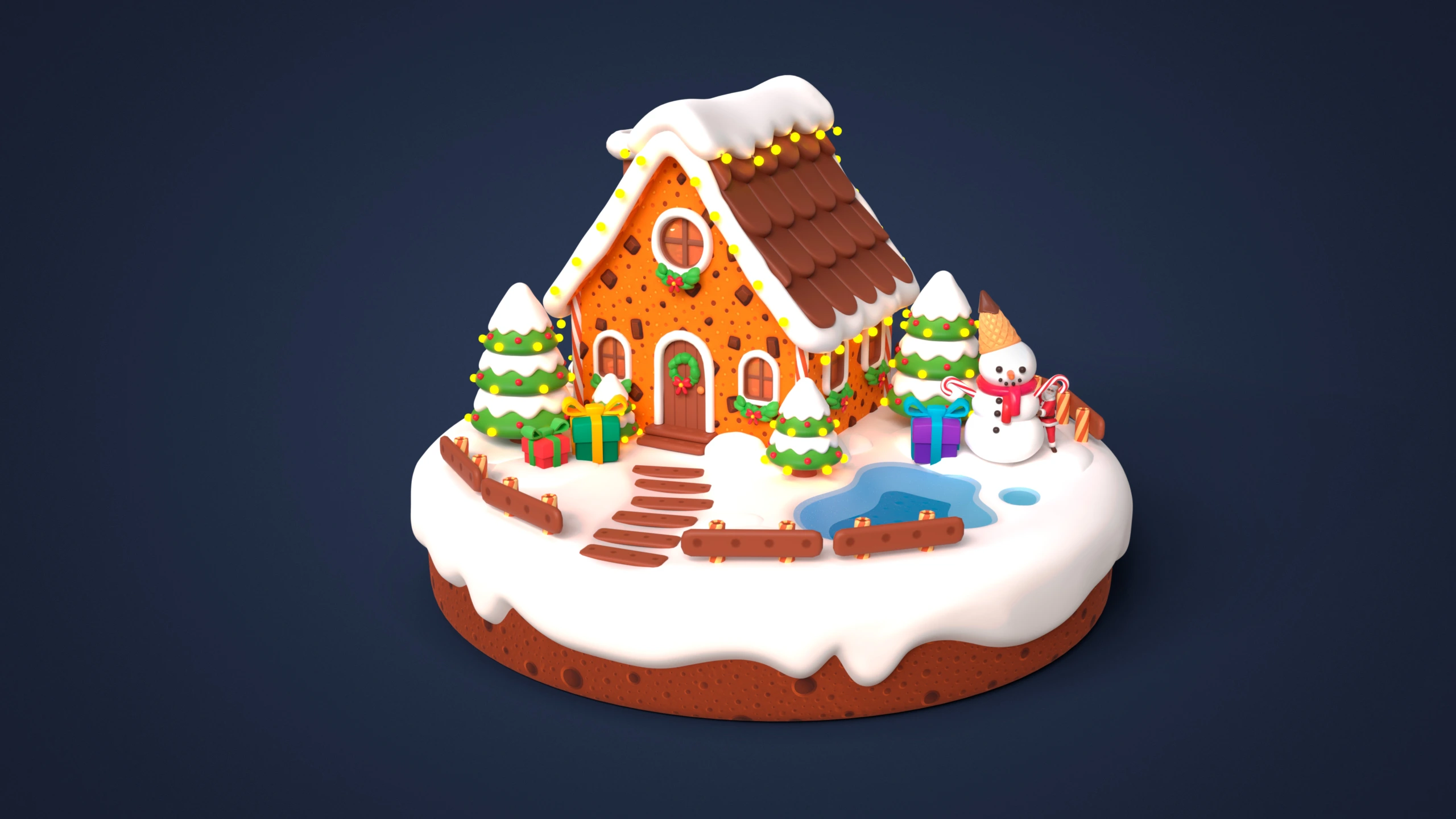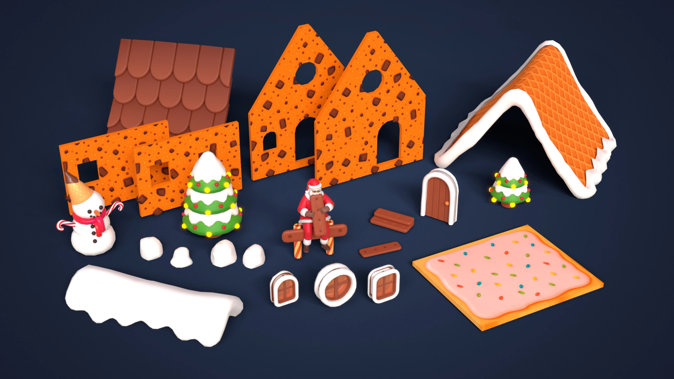 - Modular Gingerbread House: Walls, roof parts, doors, windows, icing elements, chocolate tiles, decorative details, gingerbread platform.