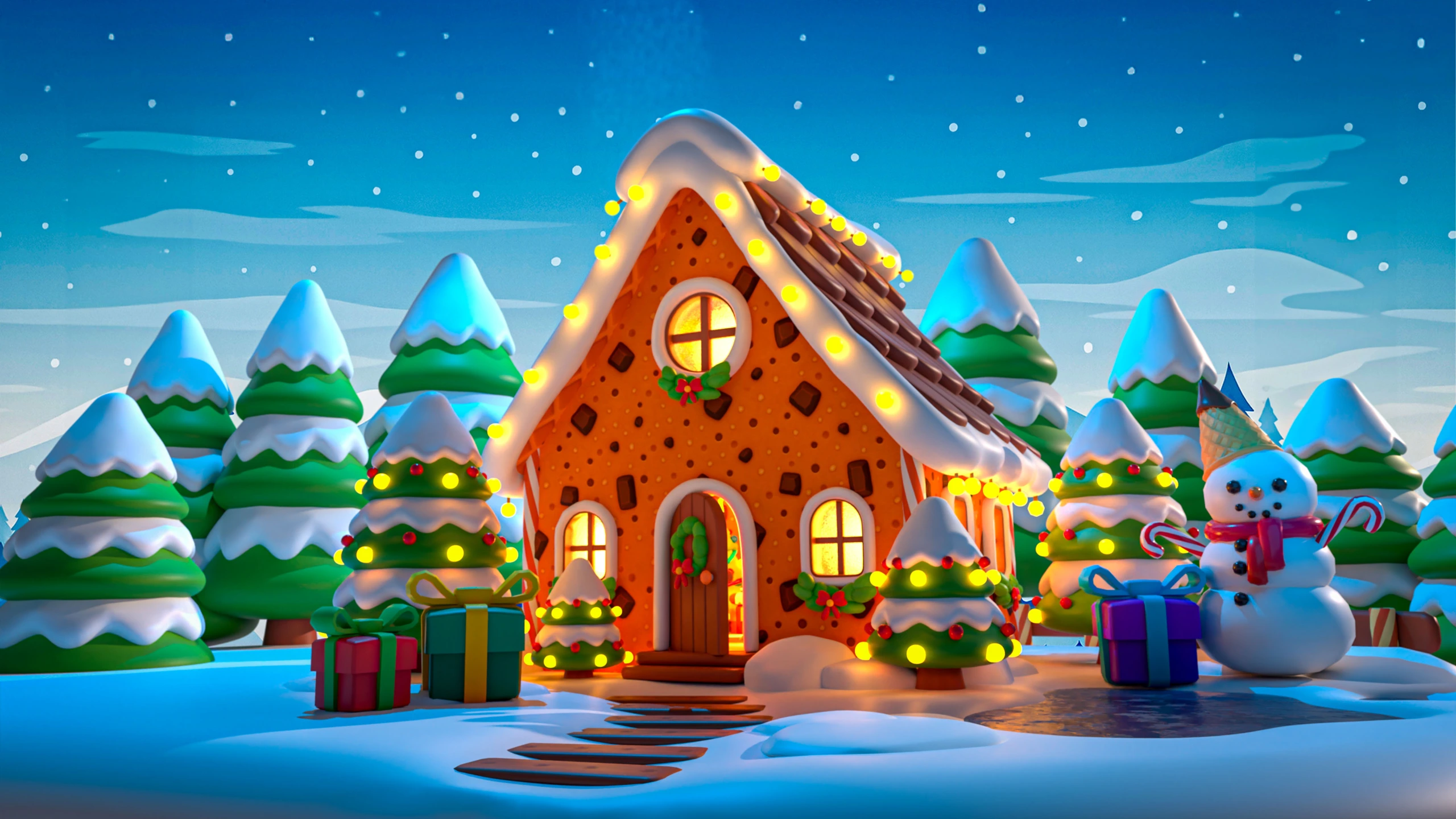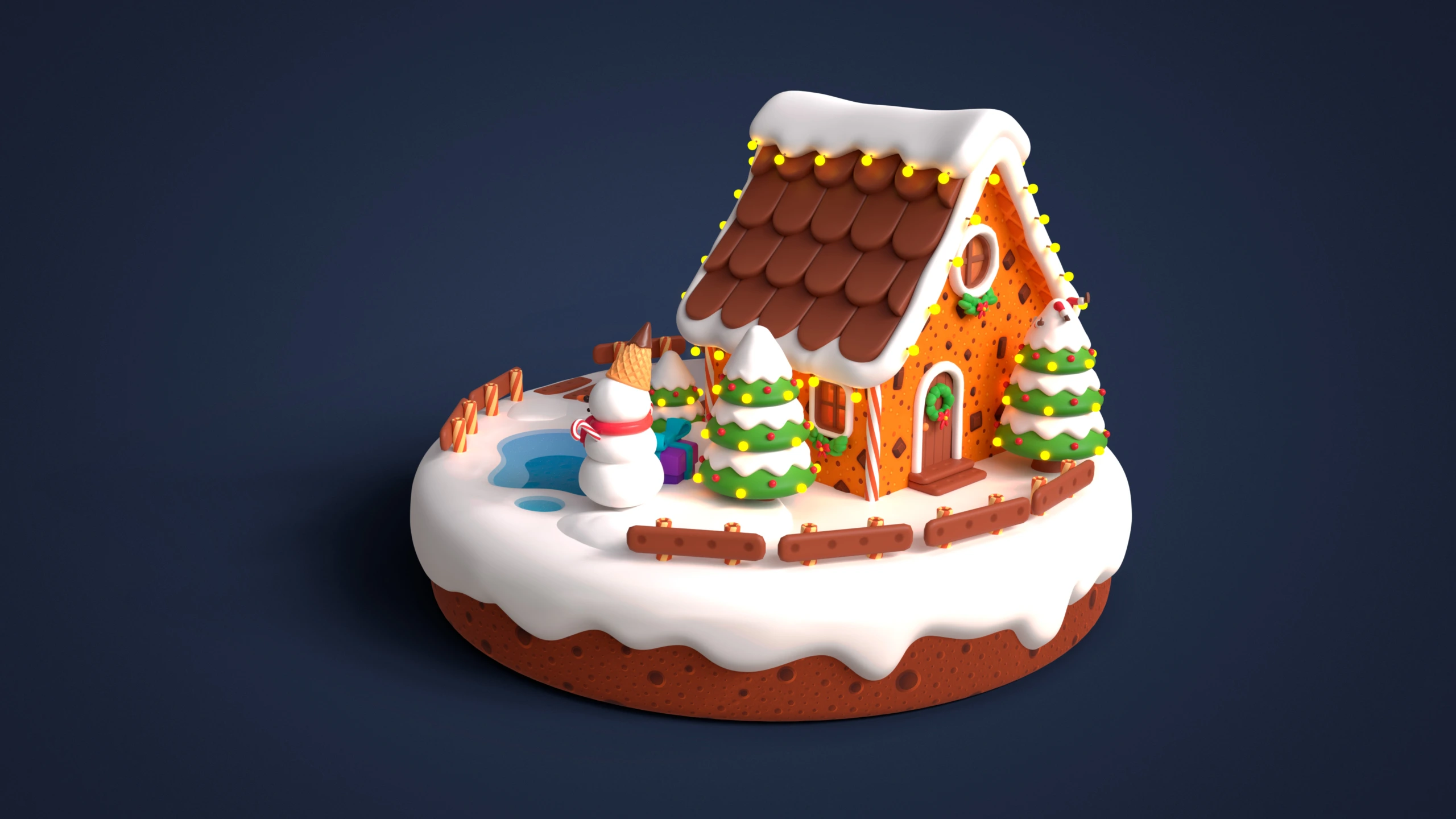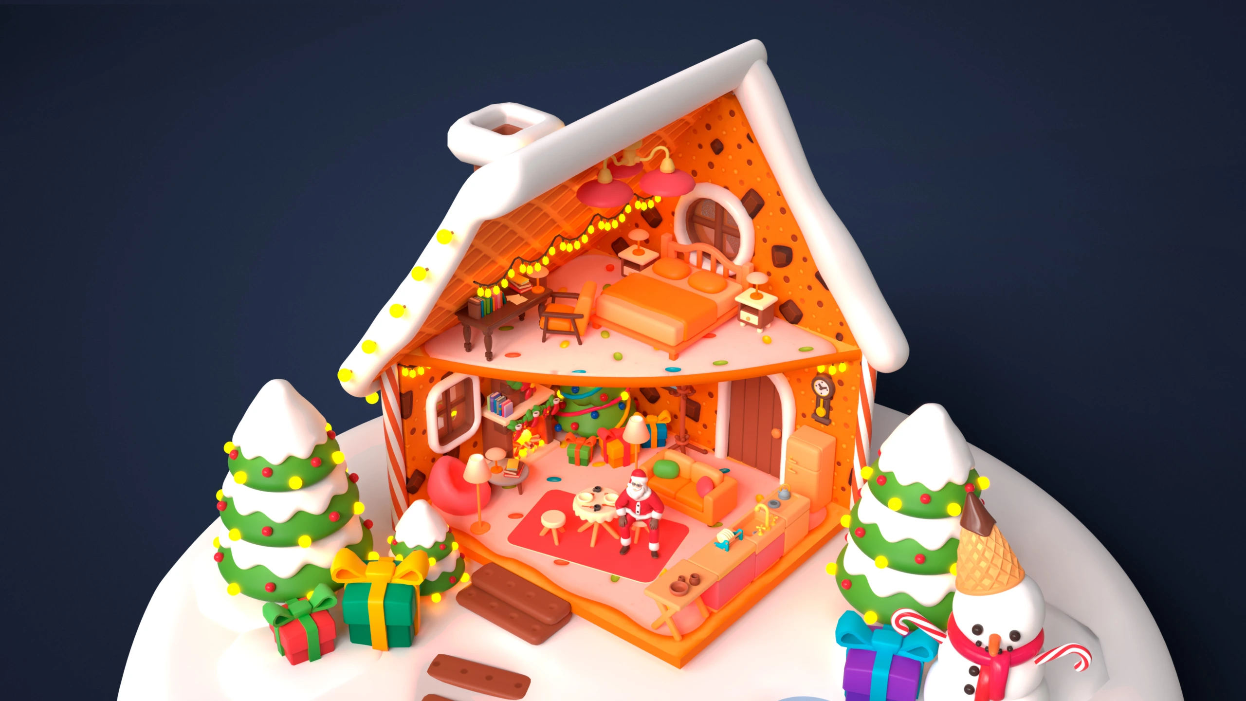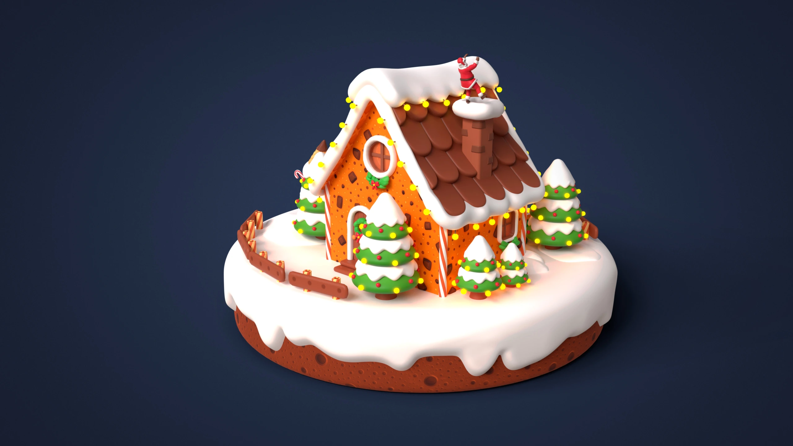 - Modular Gingerbread House: Walls, roof parts, doors, windows, icing elements, chocolate tiles, decorative details, gingerbread platform.