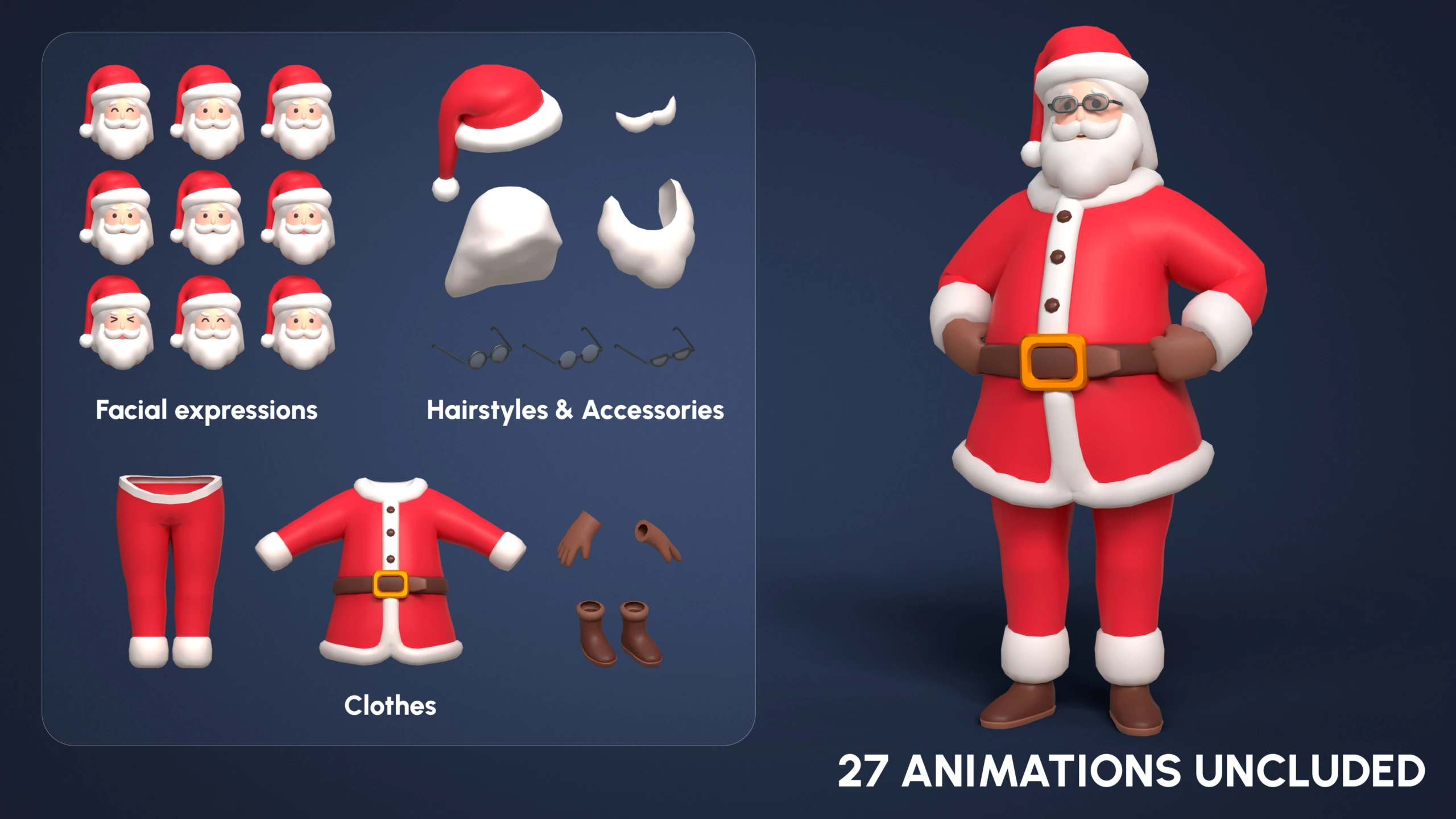 - Santa character with 27 animations, swappable clothing, facial features (beard, mustache, glasses), and 9 expressions