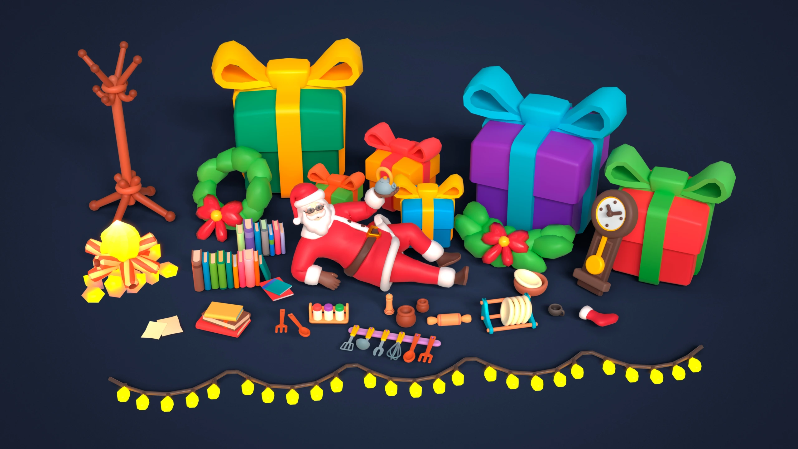- Christmas Decorations: Christmas tree, wreaths, garlands, gift boxes, stocking, clock.