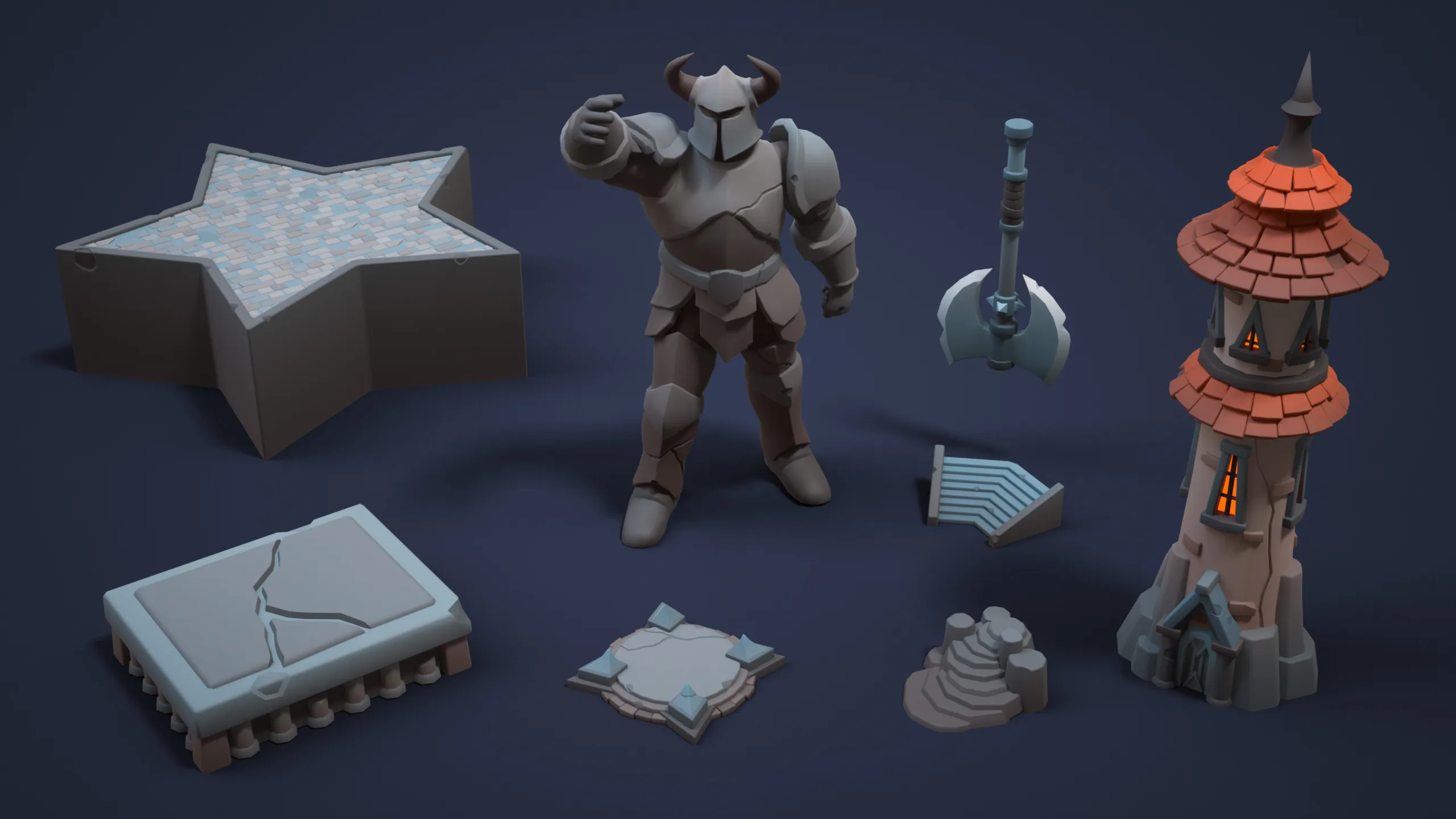 Star-shaped platform, fantasy tower. - Statues (x2)