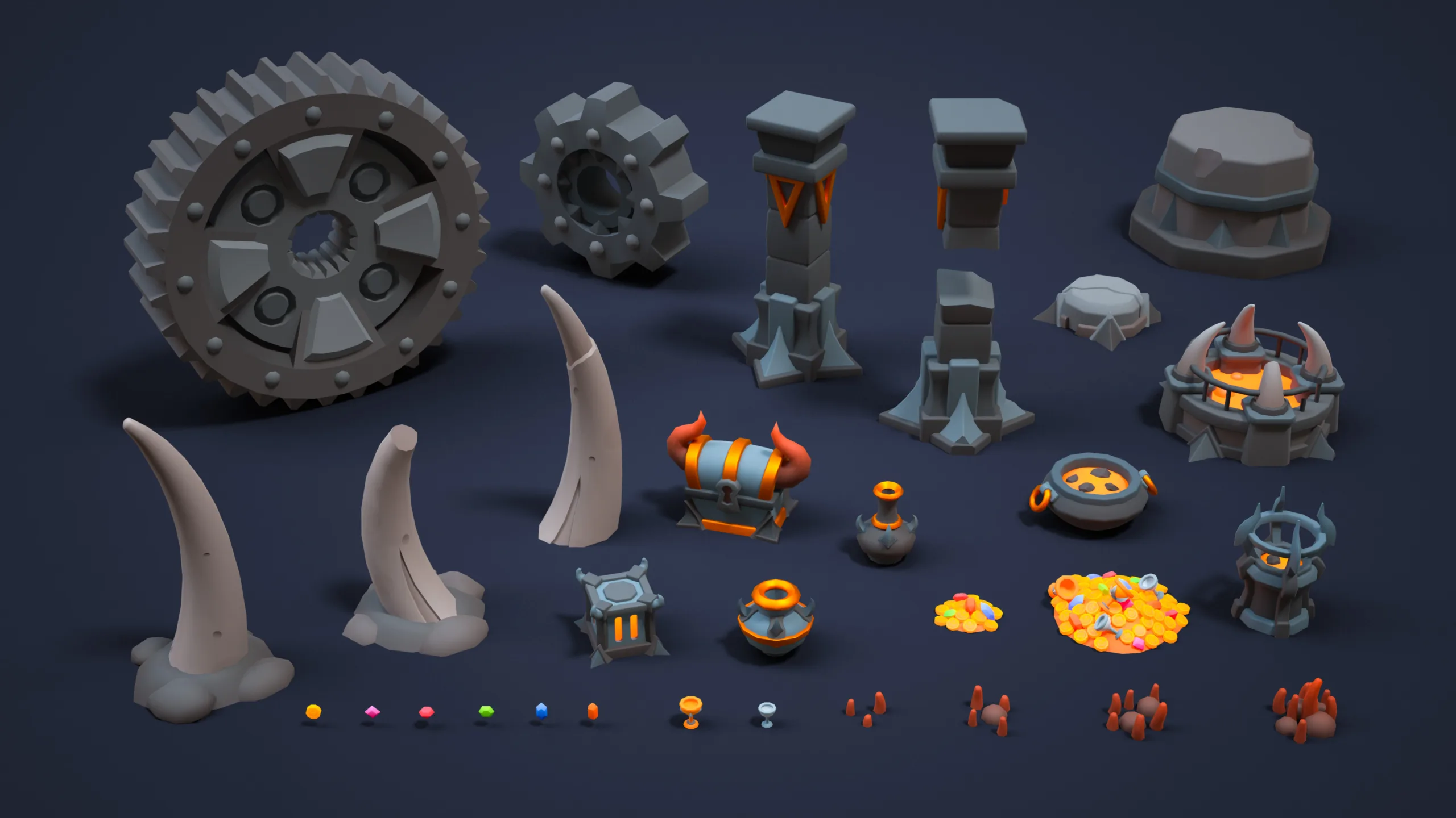 Lava braziers, cauldrons, piles of coins, treasure chests, magical artifacts, jars, crystals of various shapes and colors, goblets, and clusters of lava rock formations. - Buildings (x2)