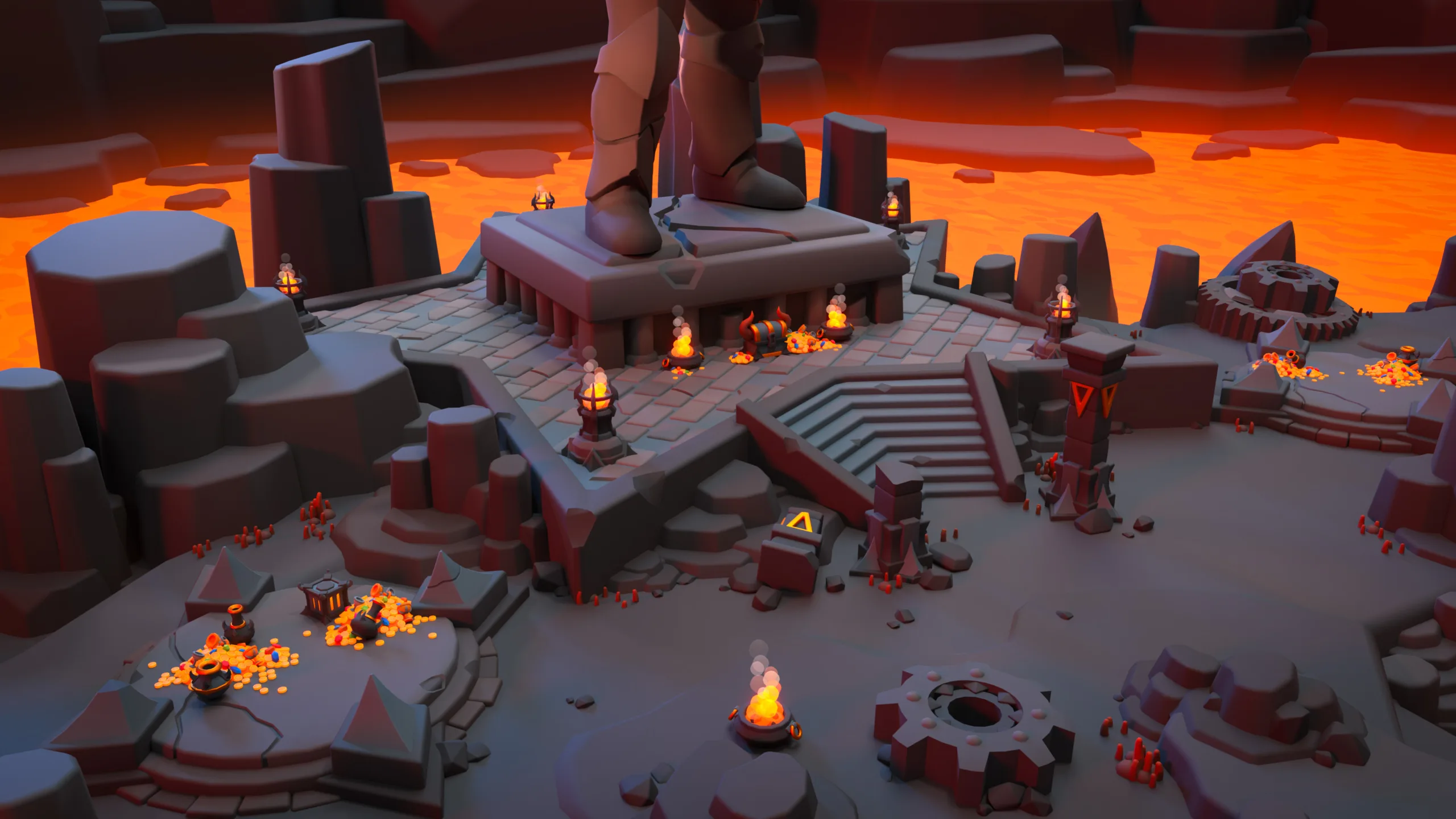 Platforms of various shapes, pillars, stairs, gears, large teeth, stone pedestals, lava pools, mechanical parts.