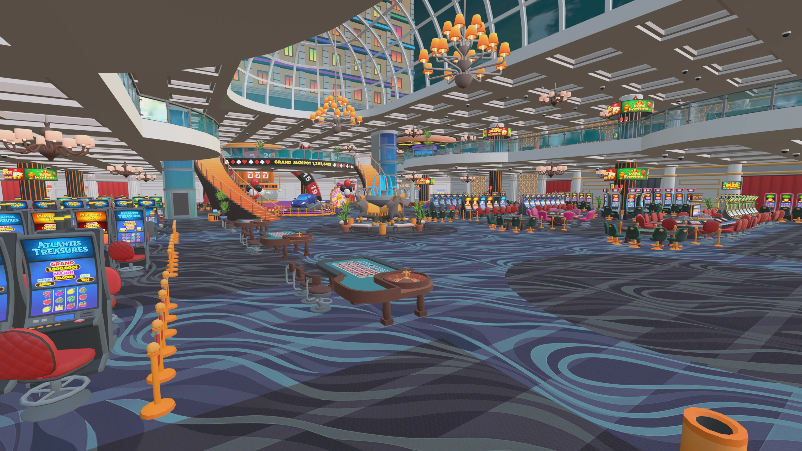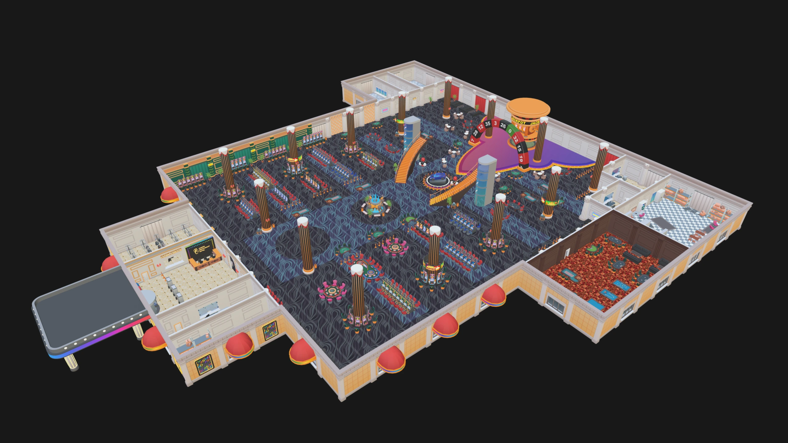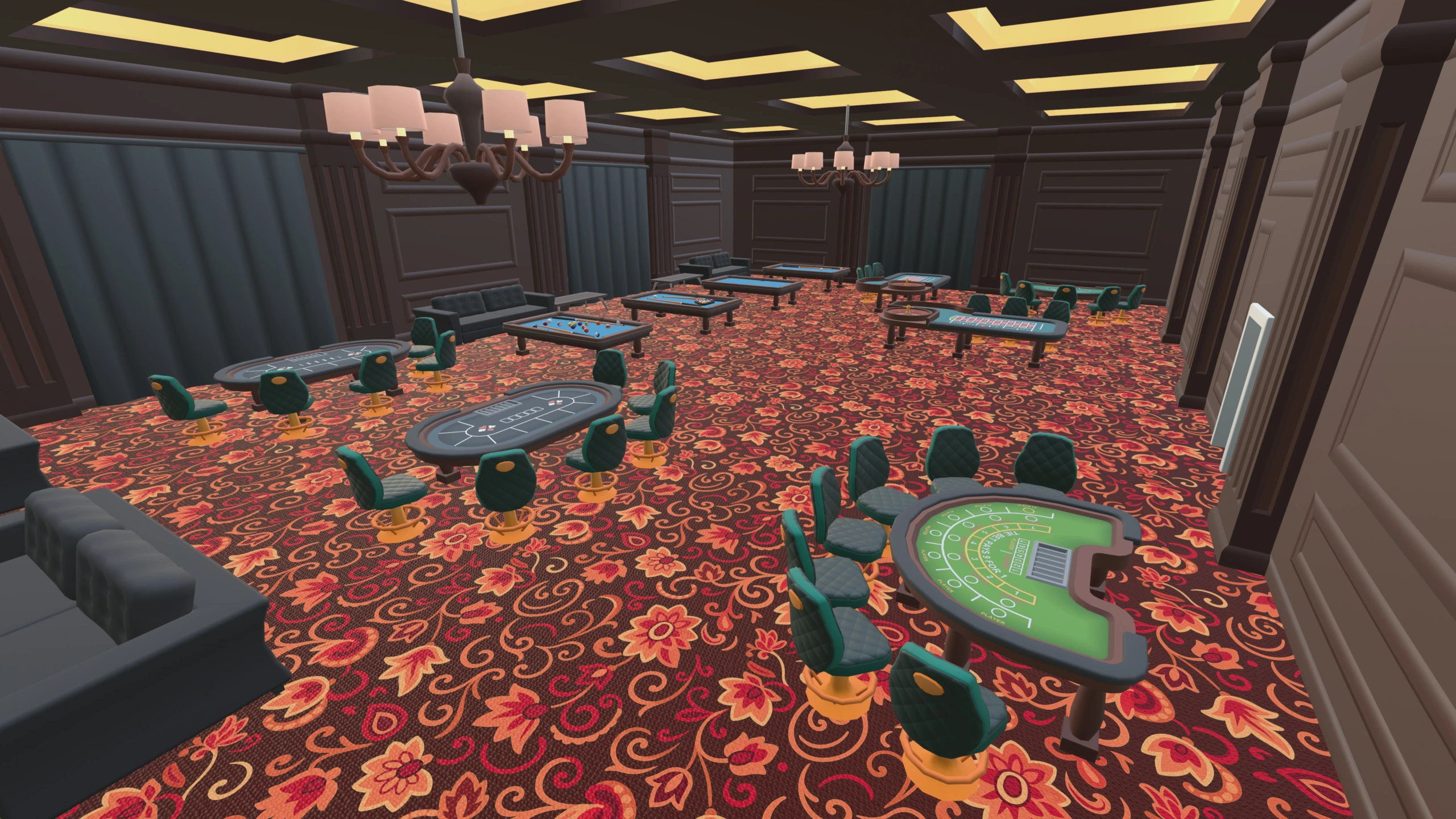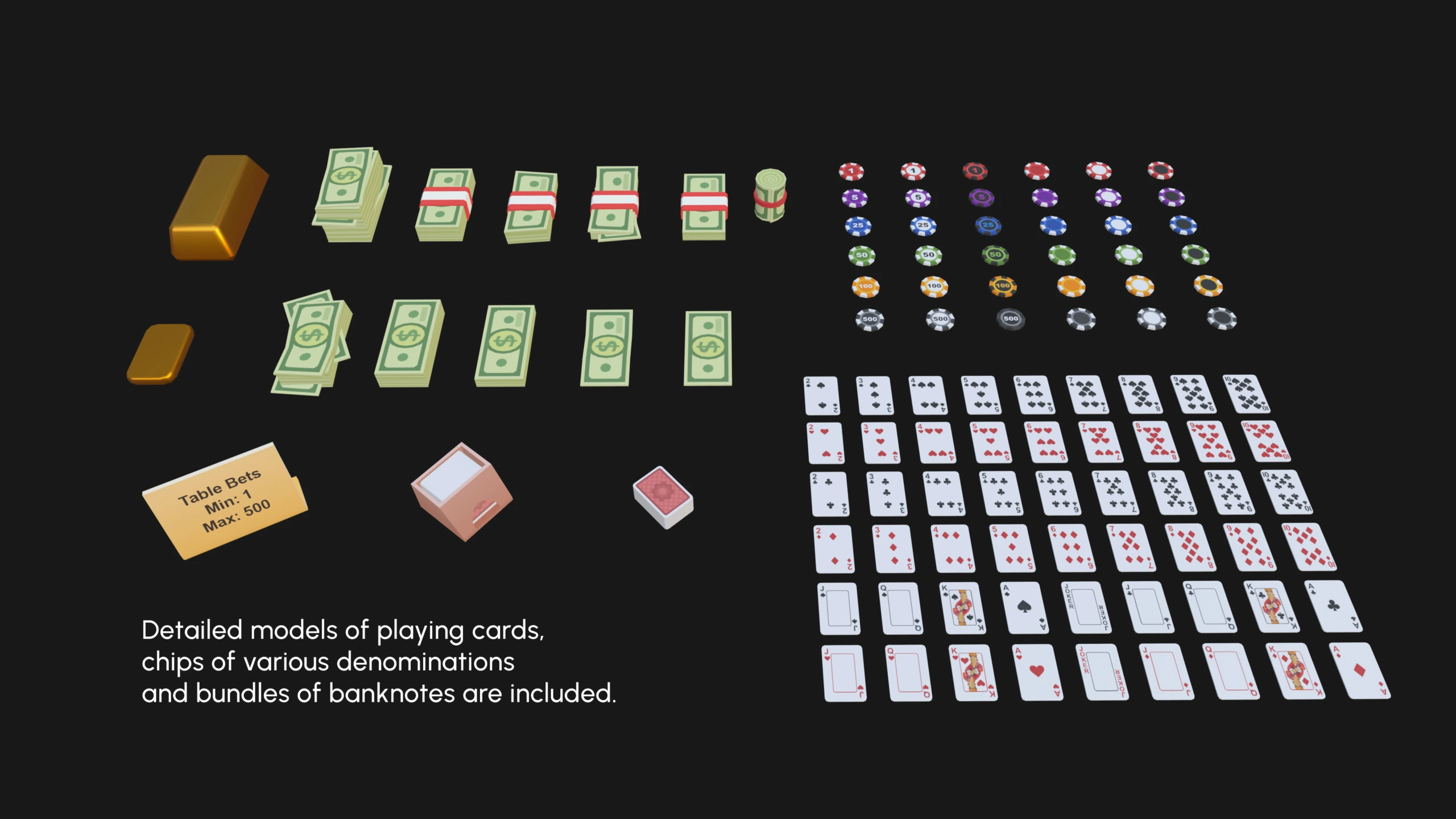 Detailed models of playing cards, chips in various denominations, and banknote stacks. - Casino Infrastructure