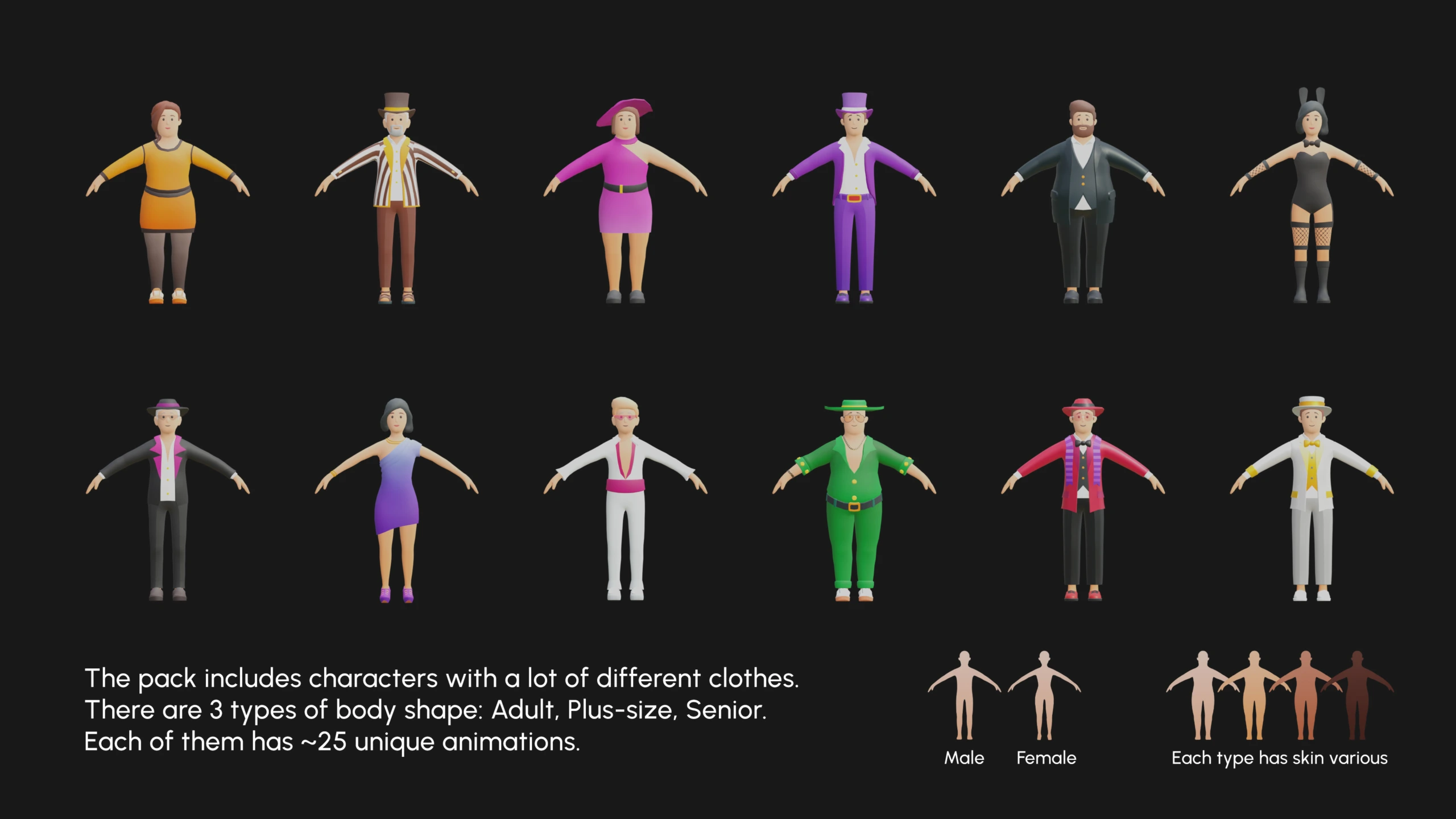 Updated urban characters with three body types (Adult, Plus-size, Senior). Each type includes standard casual wear plus unique casino outfits – evening gowns and tuxedos. - Animations