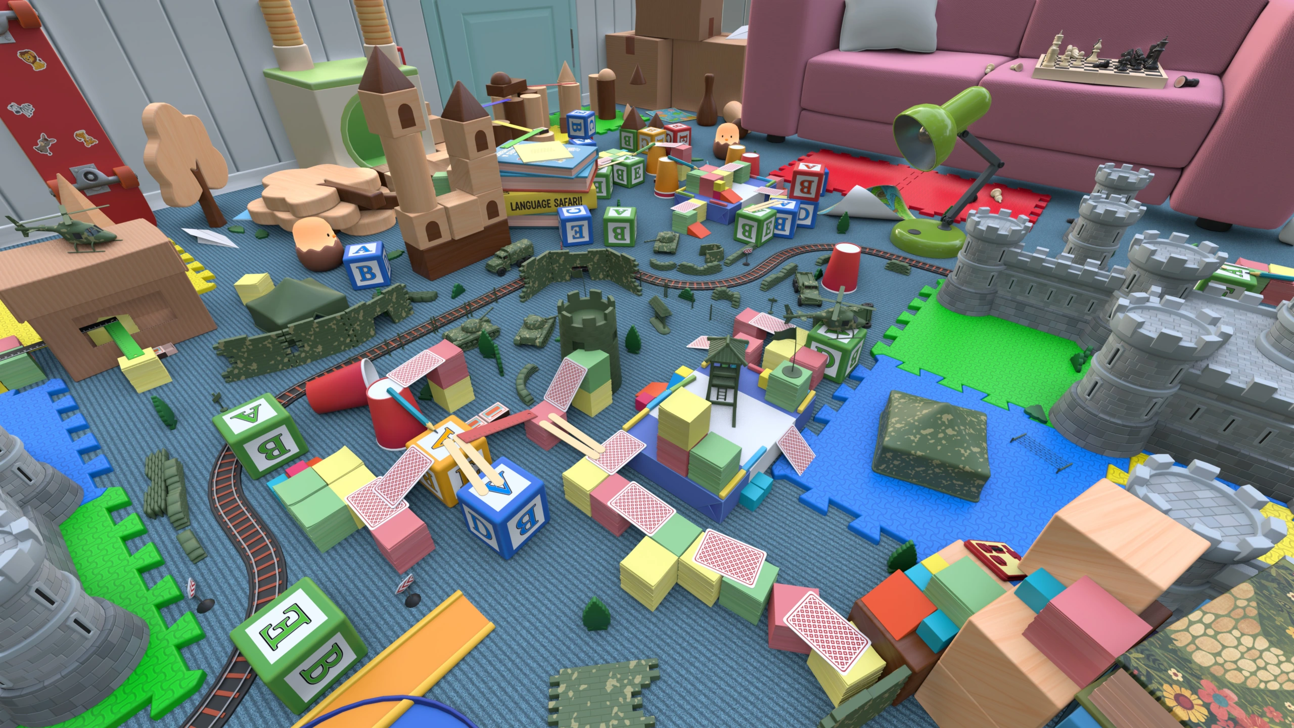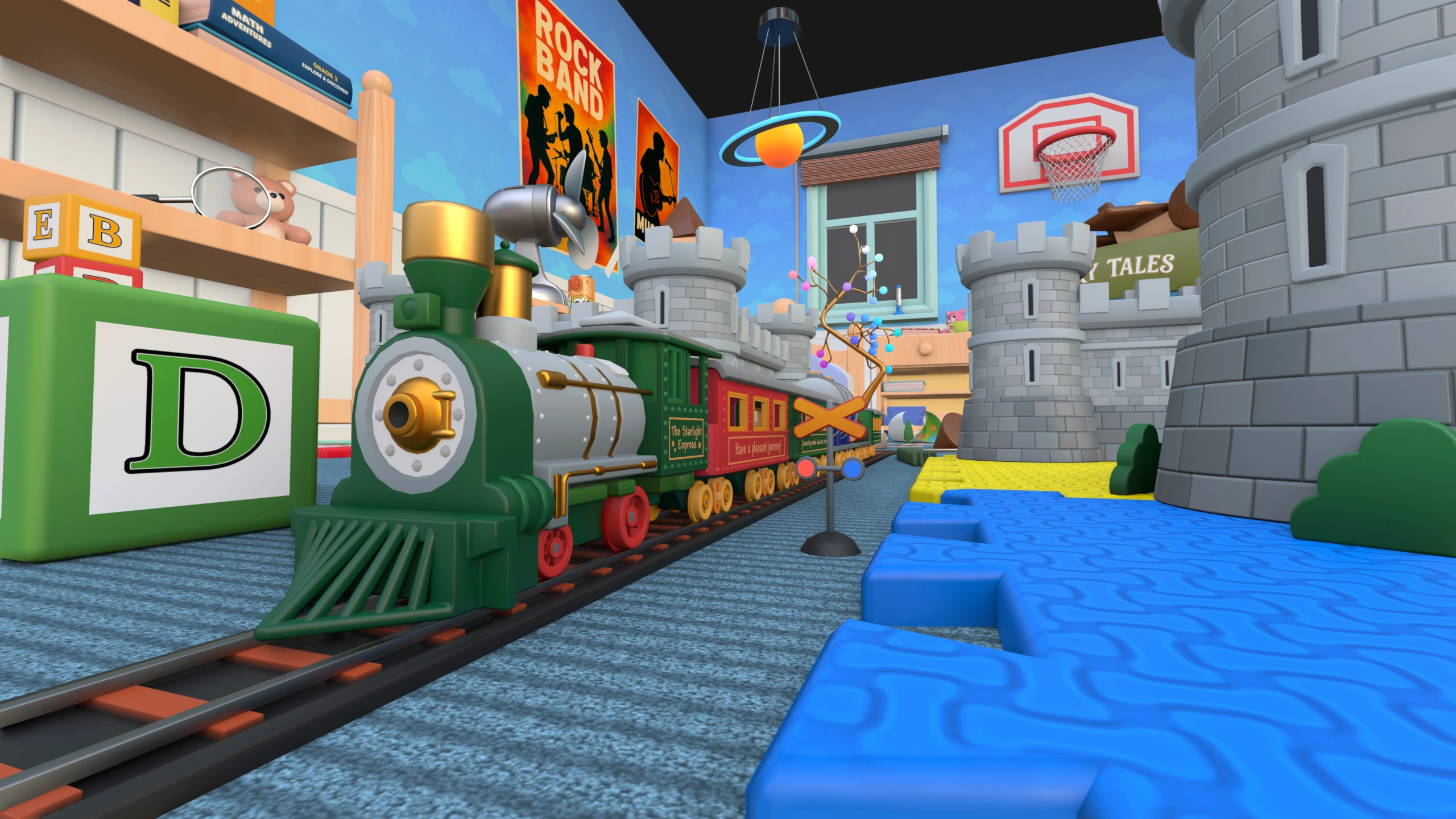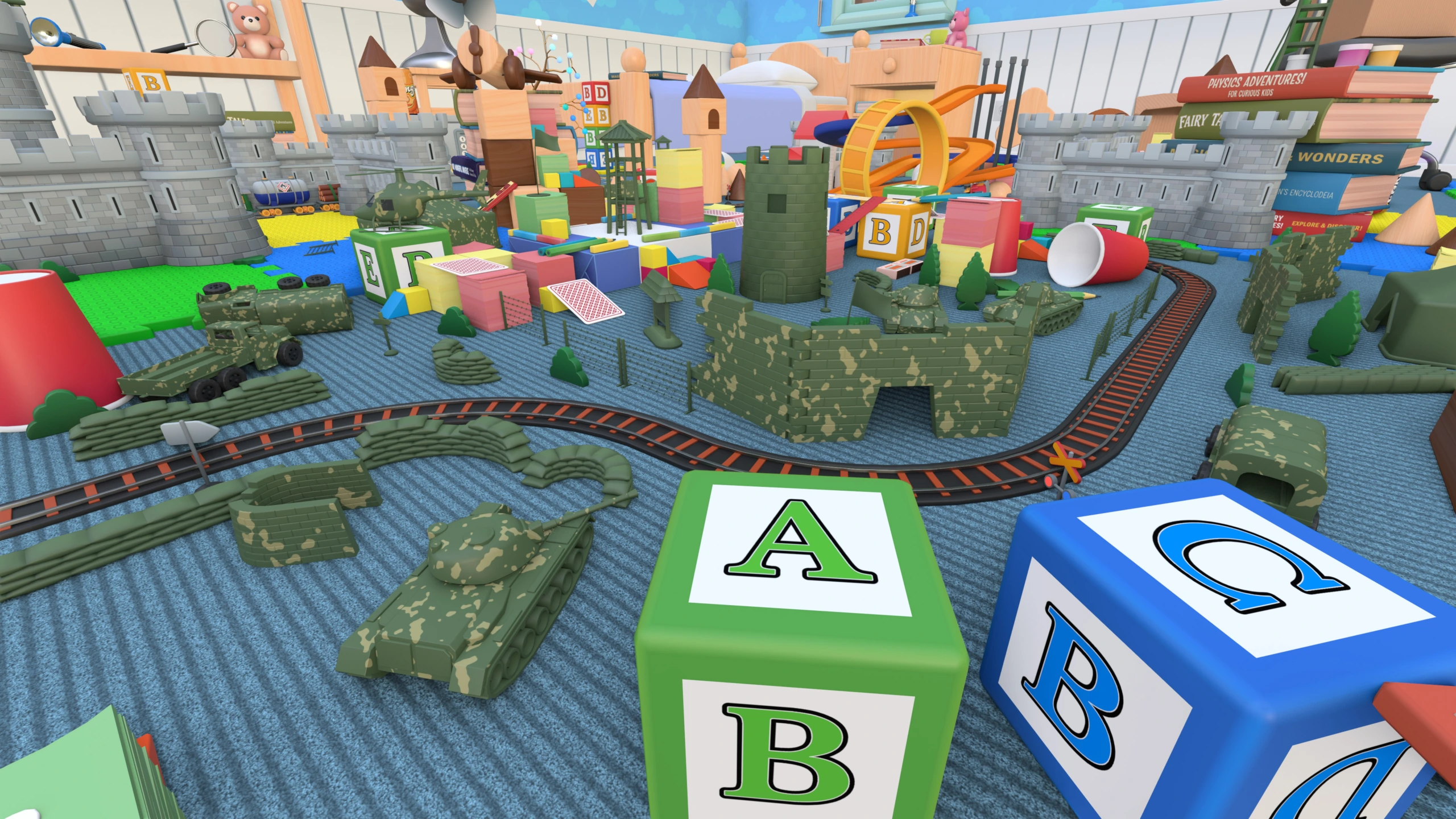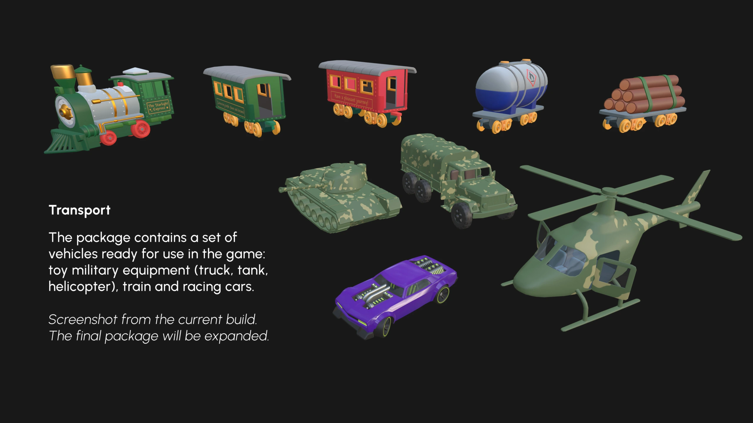 Includes game-ready vehicles: toy military equipment (truck, tank, helicopter), train, and race cars. - Interactive Design