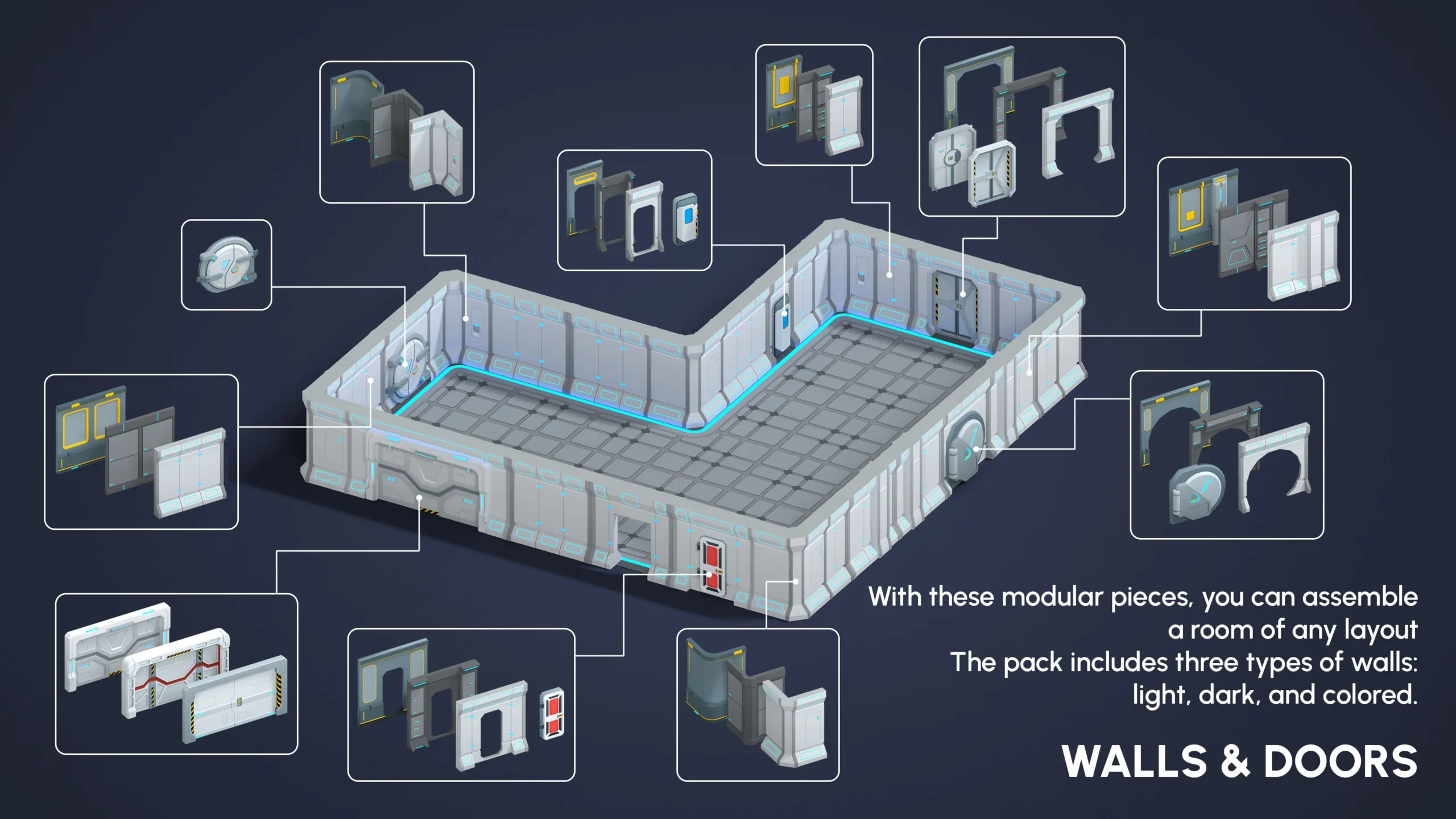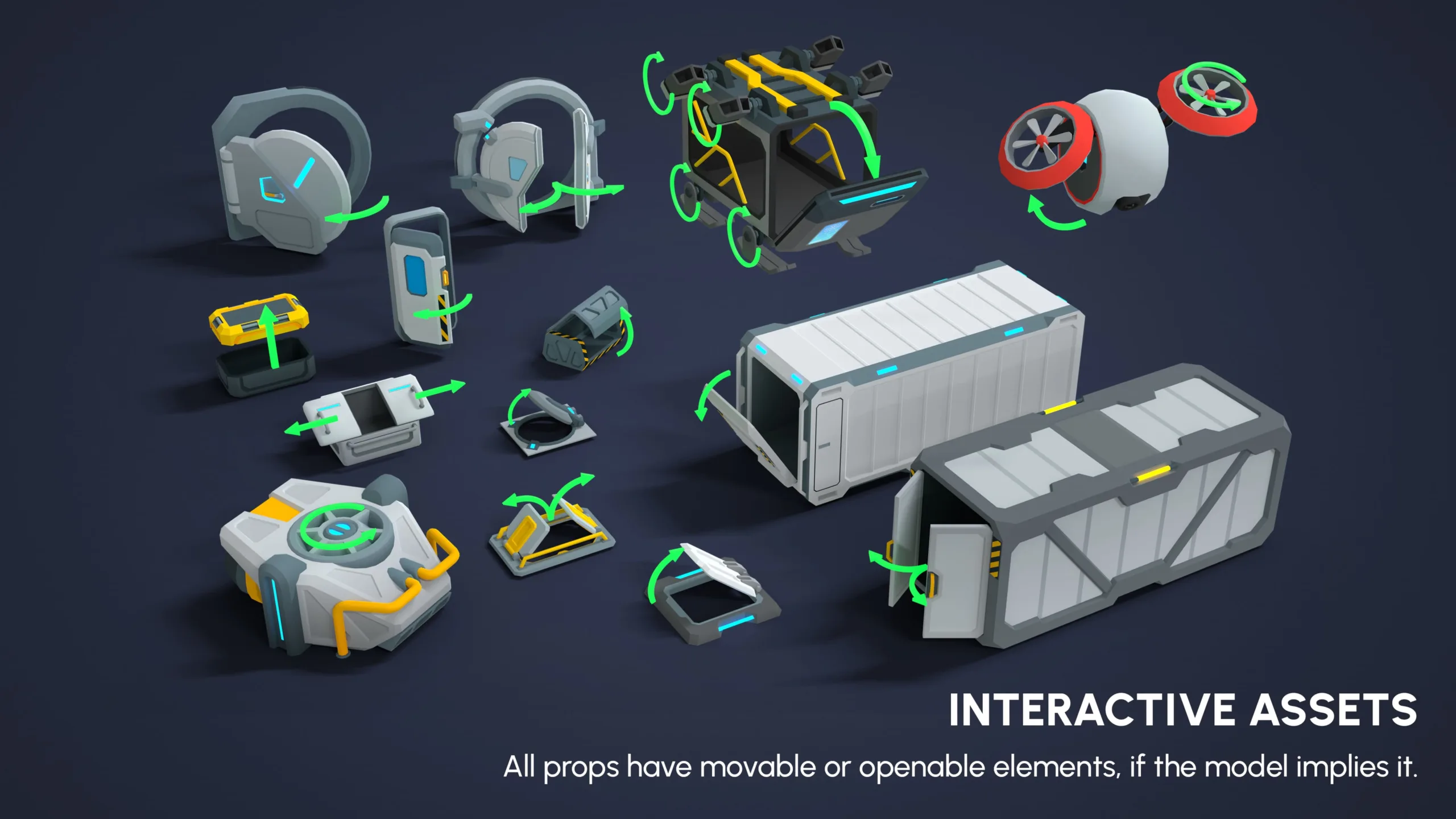 - Interactive Objects. All elements designed for interaction – such as doors, hatches, capsules, turbines, fans, holograms, or rotating/pivoting parts – are fully modular. You can animate them, control their movement, add or hide details, and place them exactly how you need to bring your scenes to life.