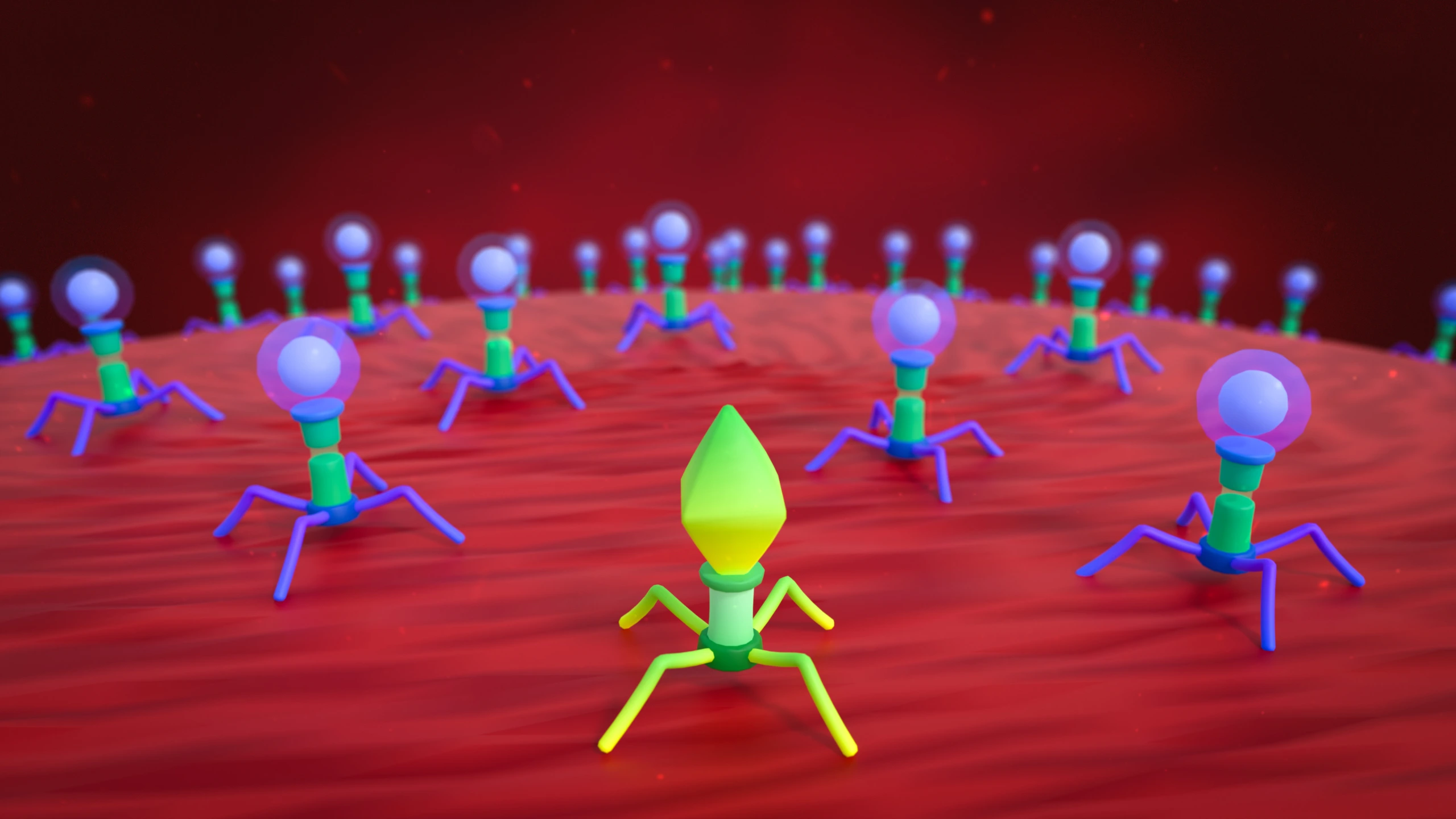 Bacteriophage T4 – virus with hexagonal head and leg-like base, infecting bacteria.